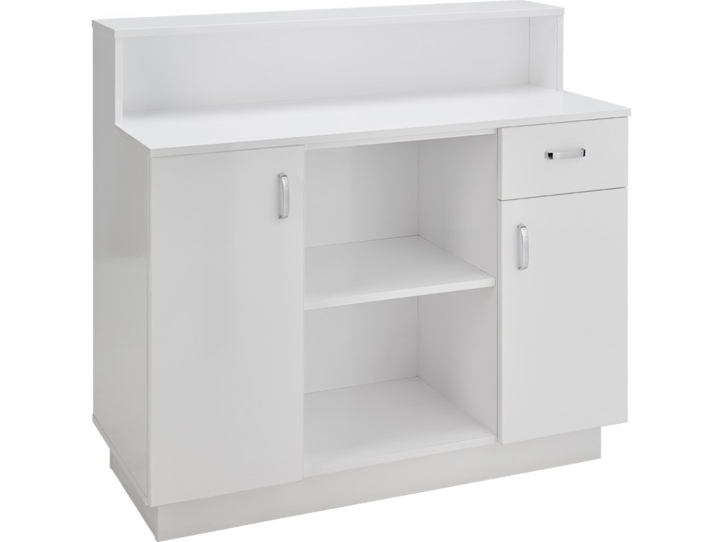 Vybaveno zásuvkou s robustním systémem Modern Box, dvěma uzamykatelnými skříňkami a dvěma otevřenými policemi