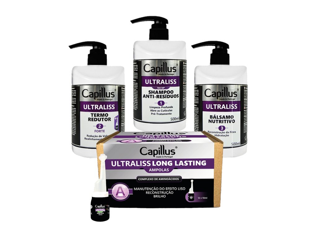 Zestaw Capillus Ultarliss Forte Professional Line to profesjonalna linia kosmetyków do progresywnego prostowania włosów z organicznym kwasem glioksalowym oraz keratyną oraz z kompleksem aminokwasów intensywnie wygładza włosy zmniejszając objętość przeciwdziałając puszeniu się włosów z efektem do 4 miesięcy.*
