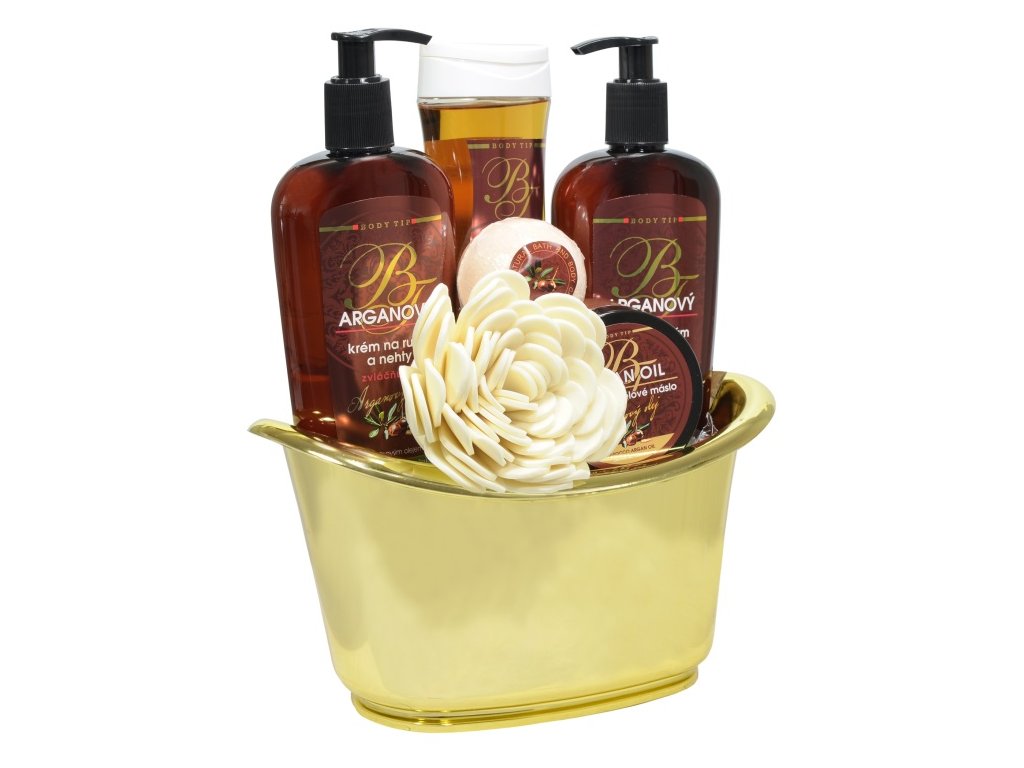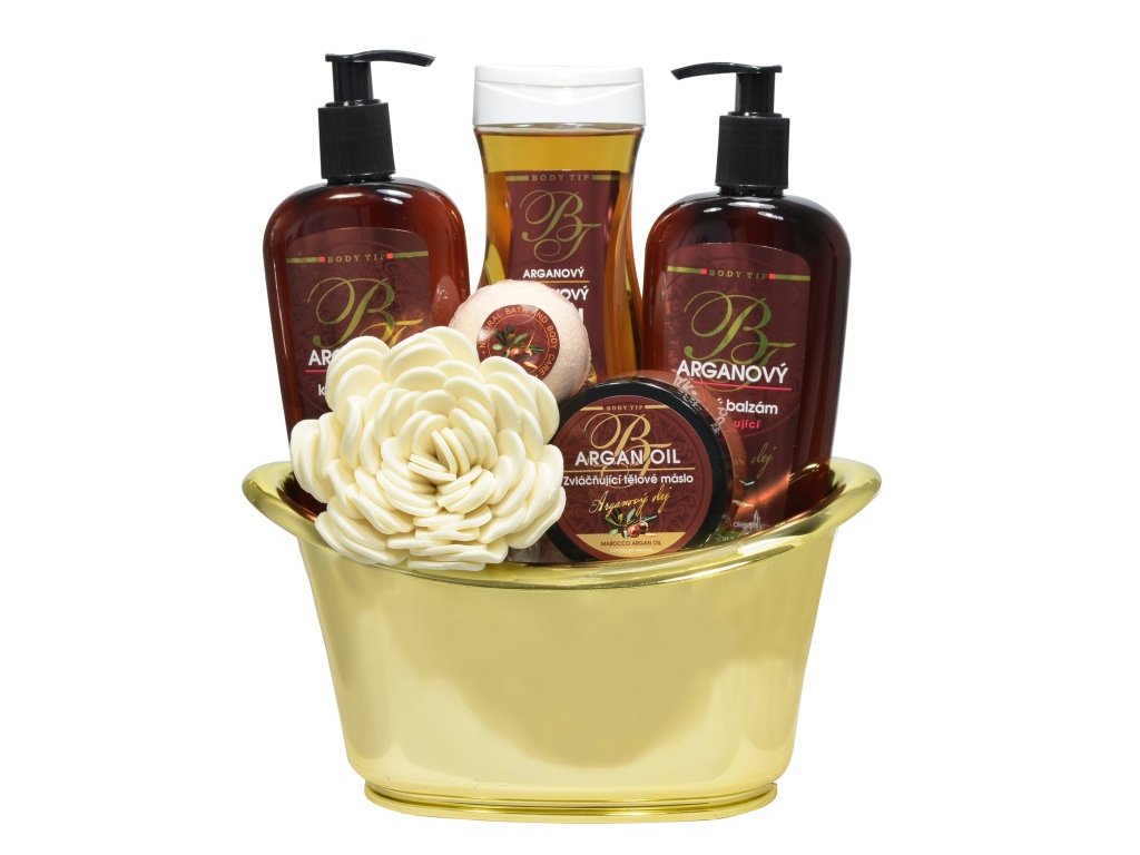 Krásné dárkové balení kosmetiky s bio arganovým olejem pro péči o pokožku těla i obličeje v dekorativní vaničce.