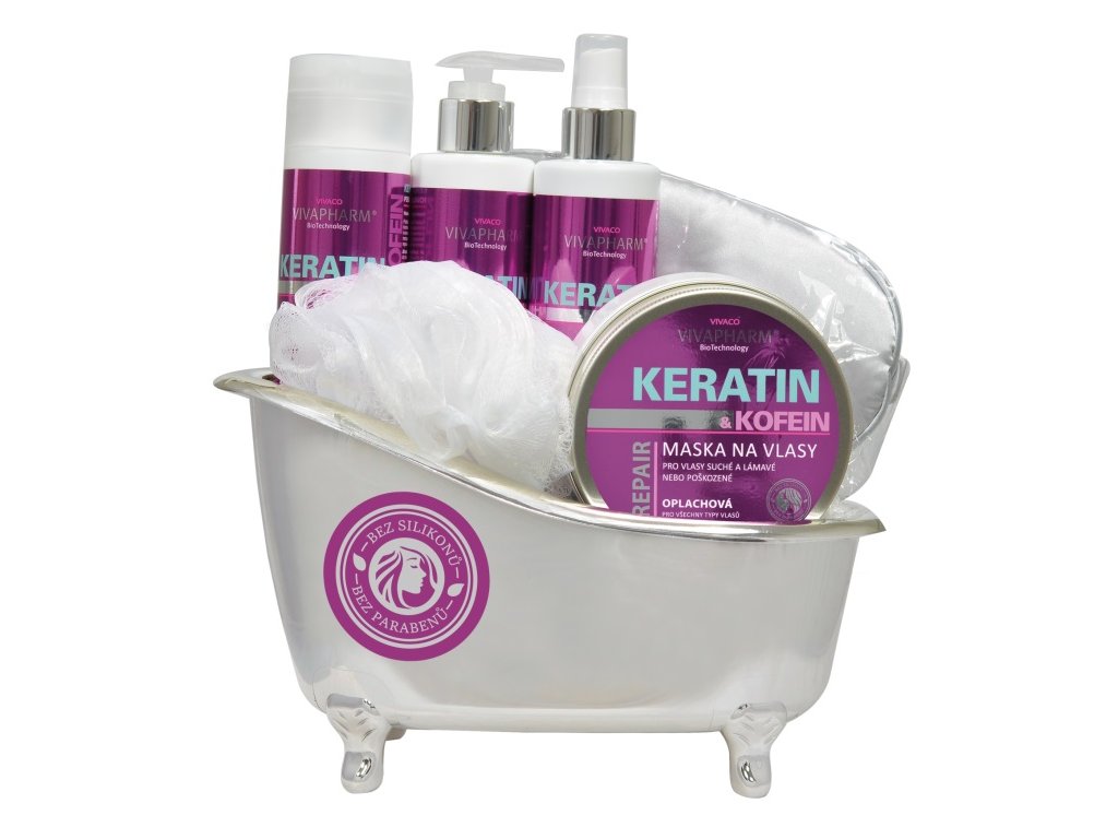 Krásné dárkové balení vlasové kosmetiky s keratinem a kofeinem pro péči o všechny typy vlasů, především poškozené, oslabené a vypadávající v dekorativní vaničce.