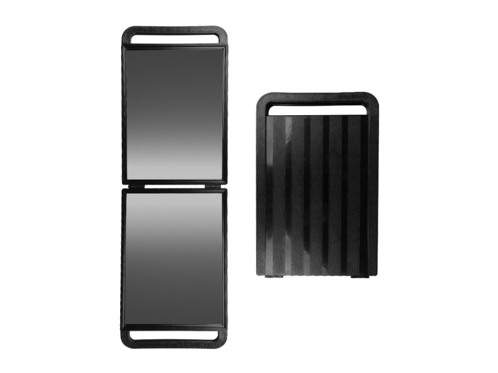 Kadeřnické zrcadlo v černém dvojitém pouzdře, skládací s madly po stranách. Ideální pro práci v kadeřnictví, kde klientovi ukážete účes na zadní straně hlavy.