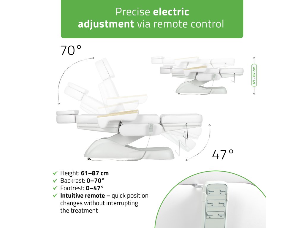 Pomocí elektrického pohonu lze přesně nastavit výšku (61–87 cm), sklon opěradla (0–70°) i nožní části (0–47°) bez narušení průběhu ošetření. Vše je ovládáno dálkovým ovladačem sladěným s čalouněním.