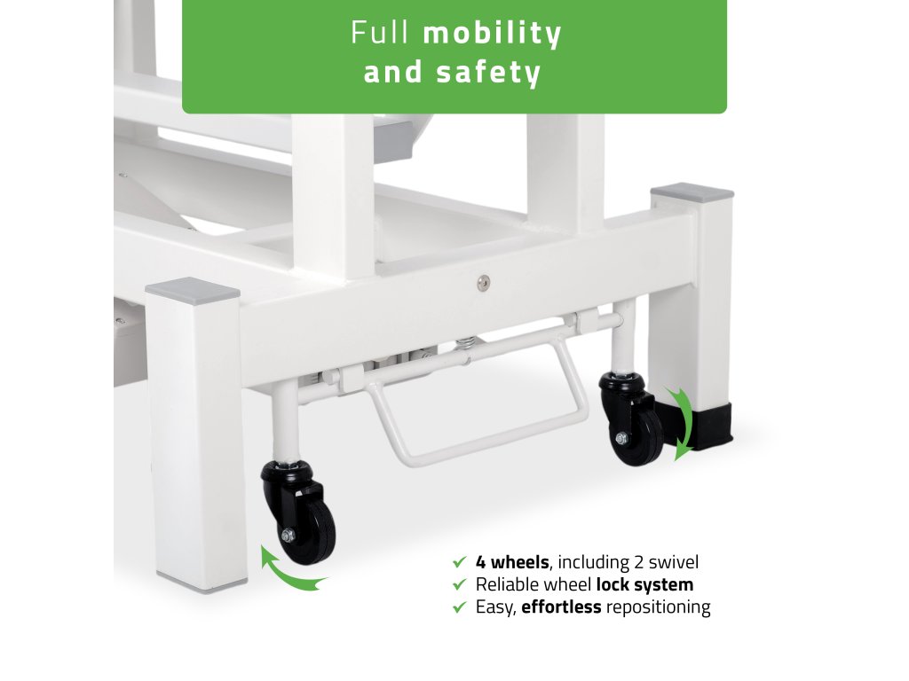 Lehátko disponuje mobilním systémem se 4 kolečky, z nichž dvě jsou otočná a dvě vybavena aretací. Držák na papírové role umožňuje snadné používání hygienických podložek.