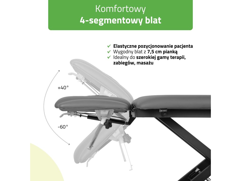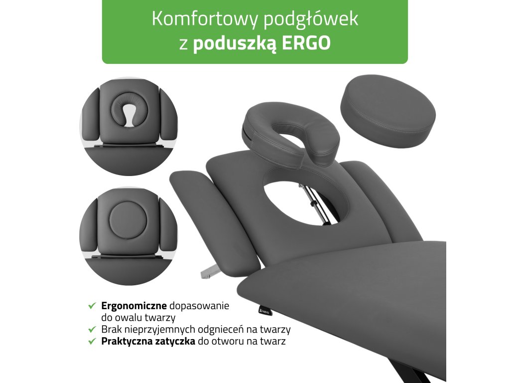 Čtyřdílná pracovní plocha umožňuje přesné nastavení těla do optimální pozice pro každou techniku. Polohovatelný podhlavník s otvorem na obličej a měkkým ERGO polštářem zajišťuje prvotřídní komfort při terapiích v poloze na břiše i na zádech. Nastavení úhlu v širokém rozsahu –60° až +40° probíhá pomocí spolehlivého plynového pístu, který poskytuje hladký a bezpečný chod.
