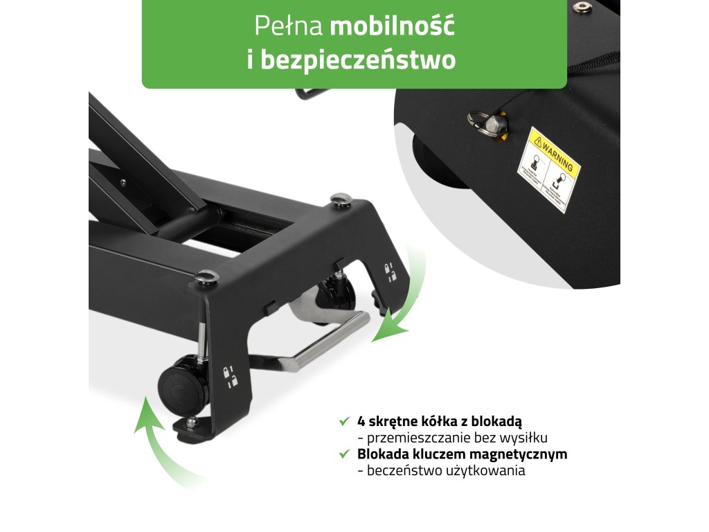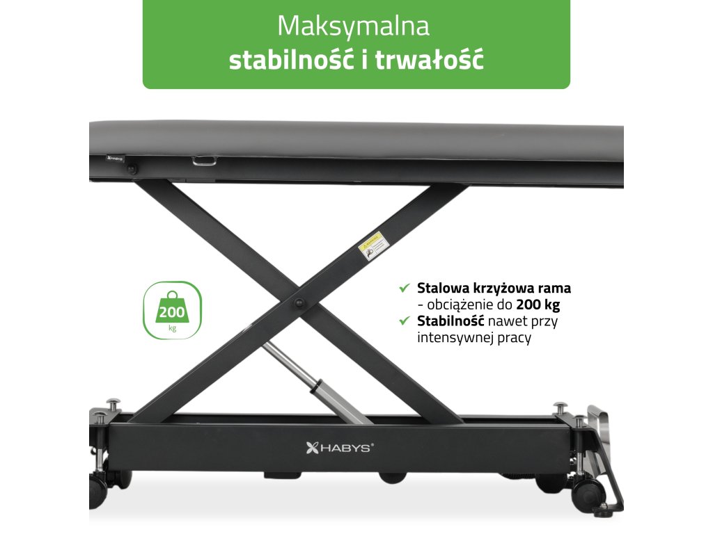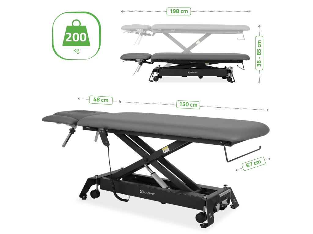 Masivní ocelová nůžková konstrukce zaručuje vysokou stabilitu a dlouhou životnost i při vysoké zátěži. Lehátko má nosnost 200 kg, proto je vhodné pro fyzioterapeutická centra, sportovní kliniky i náročné masérské provozy. Integrovaný ruční ovladač s bezpečnostní pojistkou chrání před nechtěnou změnou výšky během terapie, což zvyšuje bezpečnost klienta.