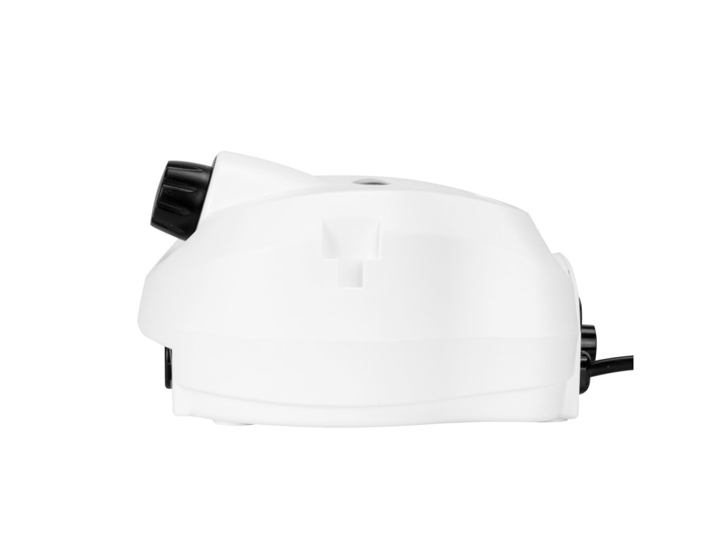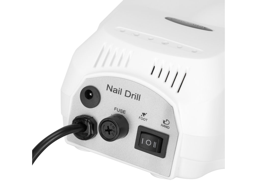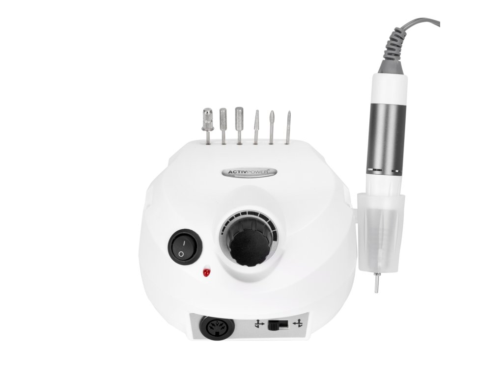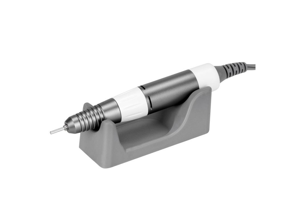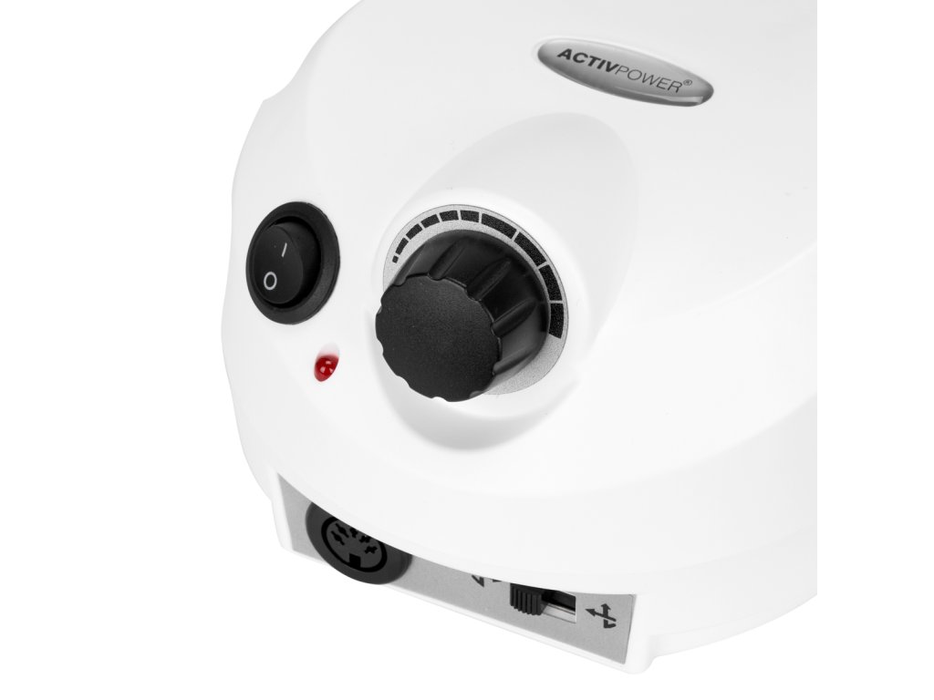 Červená dioda vedle spínače indikuje provozní stav zařízení. Rychlost otáčení frézovací hlavy lze snadno a plynule nastavit pomocí speciálního knoflíku v rozsahu od 0 do 35 000 otáček za minutu . Přepínač na přední straně zařízení efektivně mění směr otáčení , zatímco ten na zadní straně umožňuje změnu ovládání - mezi rukou a nohou . Sada obsahuje nožní pedál, jehož funkcí je zapínání frézky s přednastavenými otáčkami. To zajišťuje volnou a pohodlnou práci díky možnosti ovládat zařízení, aniž byste museli brát ruce. Během provozu lze hlavu bezpečně umístit na vyhrazený silikonový stojánek nebo zavěsit na plastový držák, který lze namontovat na obě strany zařízení.