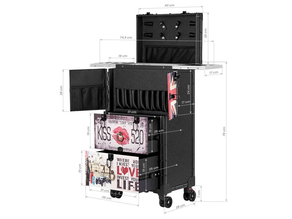 Prostorný organizér má dostatek úložného prostoru. Výsuvné police s úchyty a otvory pro příslušenství, zásuvky, přihrádky a speciální kapsy pro uložení holičských výrobků a nástrojů usnadňují udržování pořádku na pracovišti a výrazně zlepšují organizaci prostoru. Snadná montáž a demontáž koleček zlepšuje mobilitu nábytku, takže pomocníka lze volně přemisťovat. Výsuvná rukojeť umístěná na zadní straně pomocníka umožňuje snadný transport nábytku.