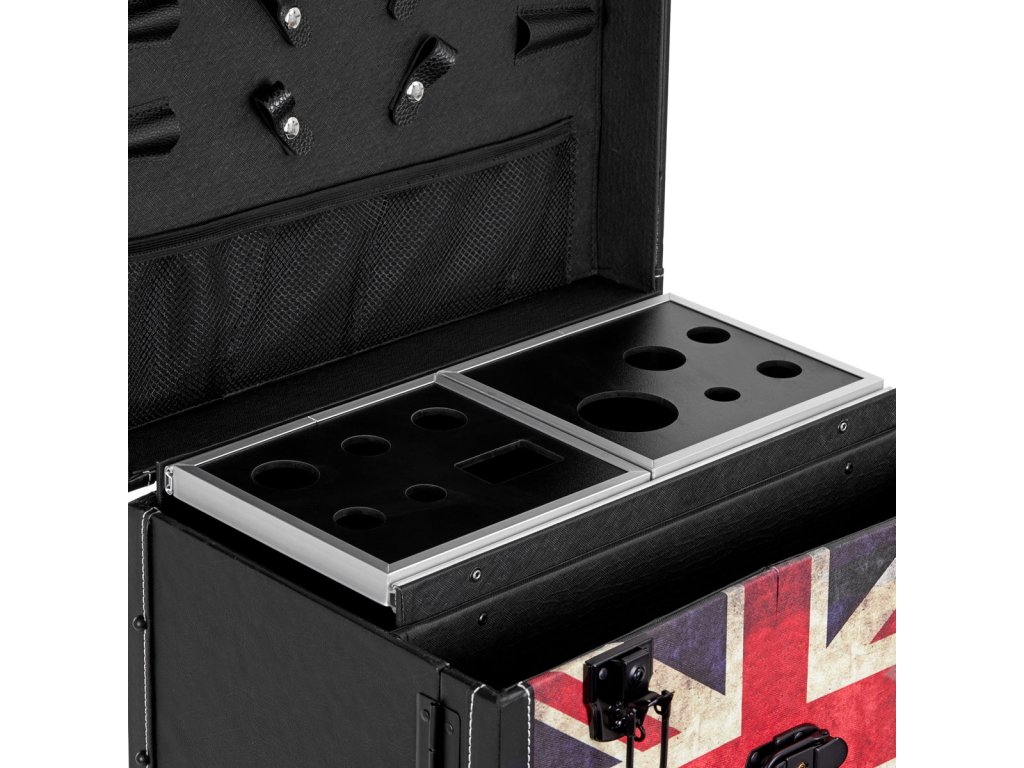 Výrazný design pomocníka Gabbiano C12 je dokonalým řešením pro holičství, která ocení jedinečný vzhled a elegantní detaily. Čela skříněk zdobí stylizované britské vzory, které jistě podtrhnou atmosféru interiéru. Materiál připomínající kůži v odstínech černé a kovové prvky dodávají nábytku eleganci, mužný nádech a luxusní vzhled. Pomocník bude vynikající volbou pro ty, kteří ocení zajímavý design i funkčnost.