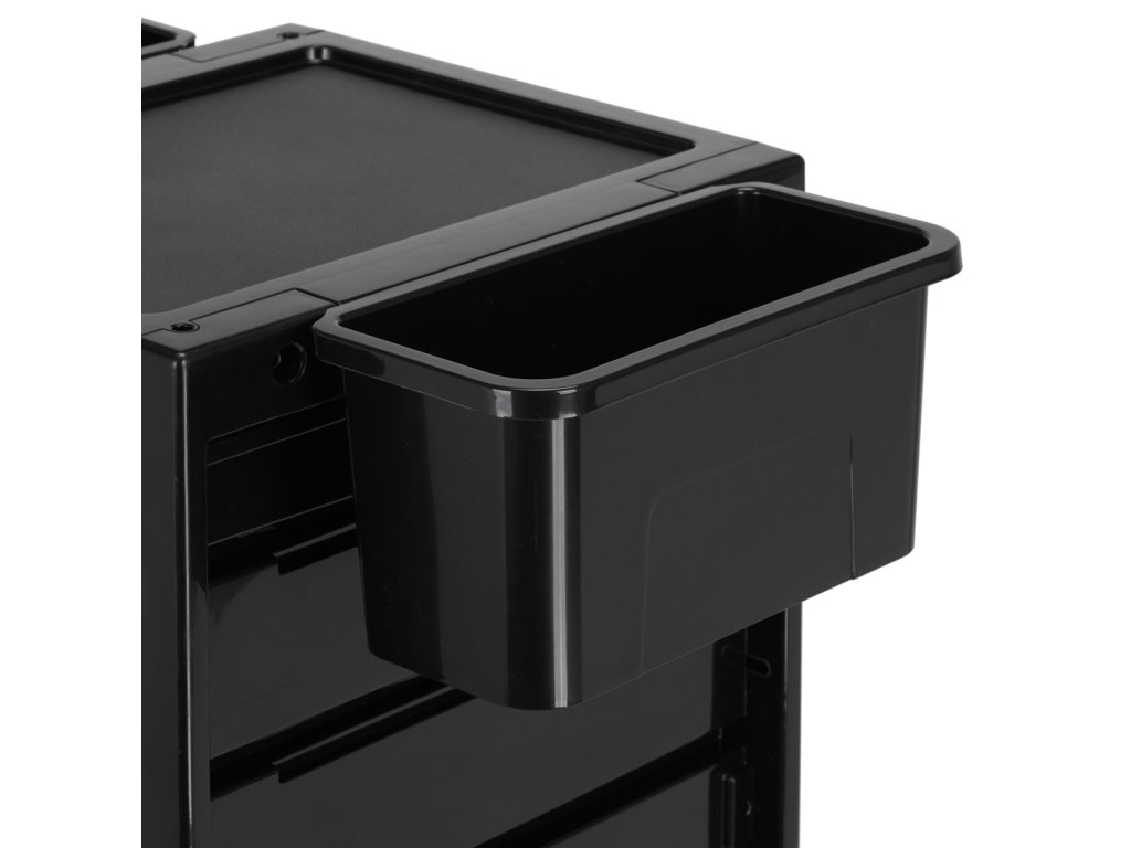 Objemný organizér je vybaven sadou odkládacích přihrádek, které vám pomohou udržovat pořádek na pracovišti a organizovat kadeřnické pomůcky. Sada obsahuje šest zásobníků: dva bez přihrádek, dva s přihrádkami a dva úzké a hlubší. Jejich uspořádání v organizéru můžete libovolně měnit podle vlastních potřeb a značný výběr různých typů zásuvek vám umožní roztřídit si náčiní podle vlastního uvážení. Dvě nejhlubší zásuvky lze navíc umístit do různých výšek po stranách pomocníka, takže nádobí v nich uložené bude vždy ve správné výšce. U tohoto modelu se zásuvky vysouvají do obou stran, což je výrazné vylepšení a usnadňuje kdykoli přístup k výrobkům a nádobí.