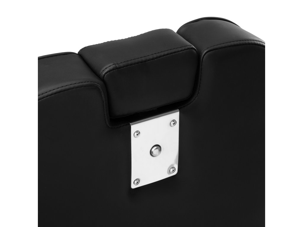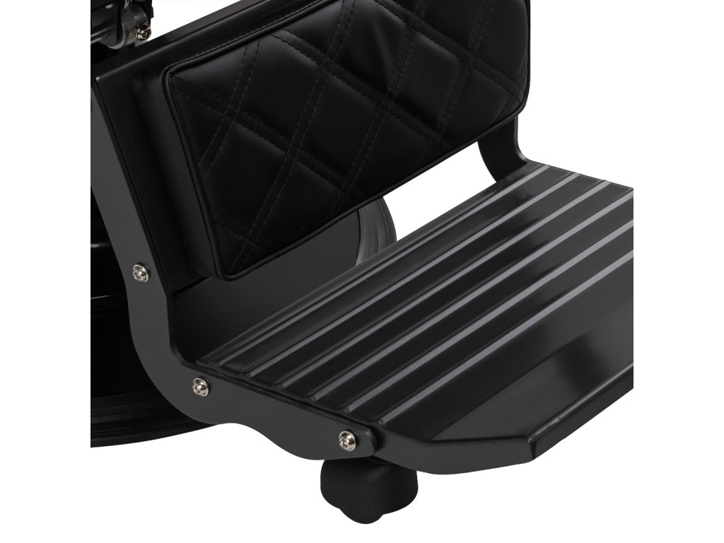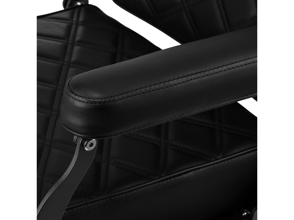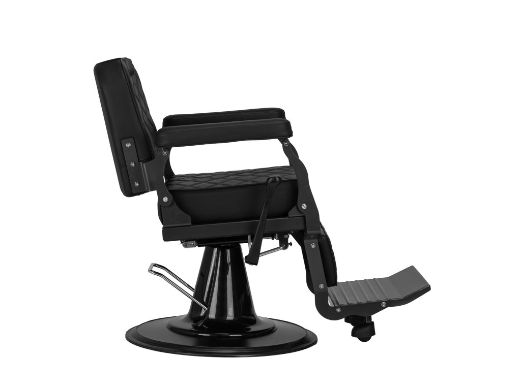 Pevná konstrukce zajišťuje stabilitu a vysoký komfort používání. Sedák vyplněný pěnou odolnou proti deformacím a čalounění z měkké matné syntetické kůže zajišťují odolnost a pohodlí nábytku. Materiály odolné proti vlhkosti jsou nejen trvanlivé, ale také se snadno čistí. Černý odstín čalounění dodává křeslu jedinečný charakter, a jeho elegantní styl dokonale ladí s interiérem každého holičství.