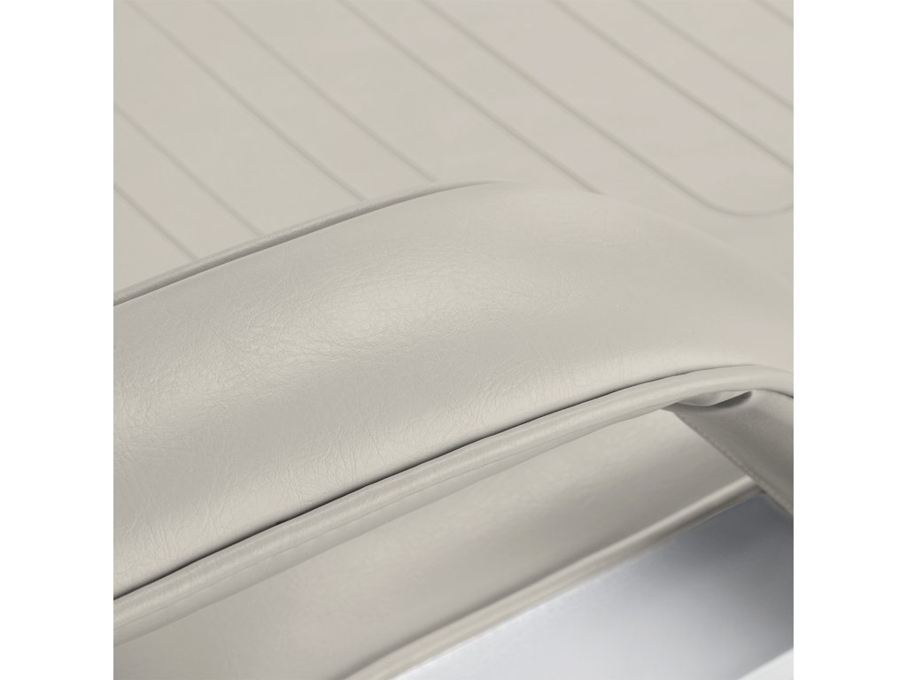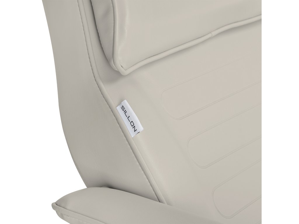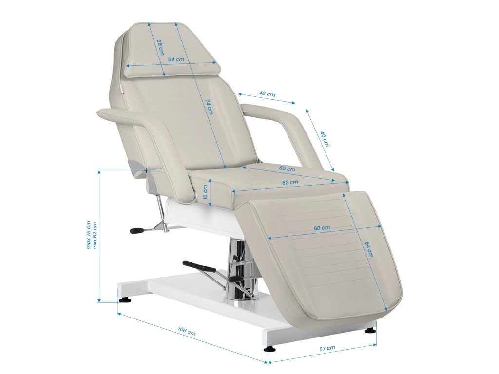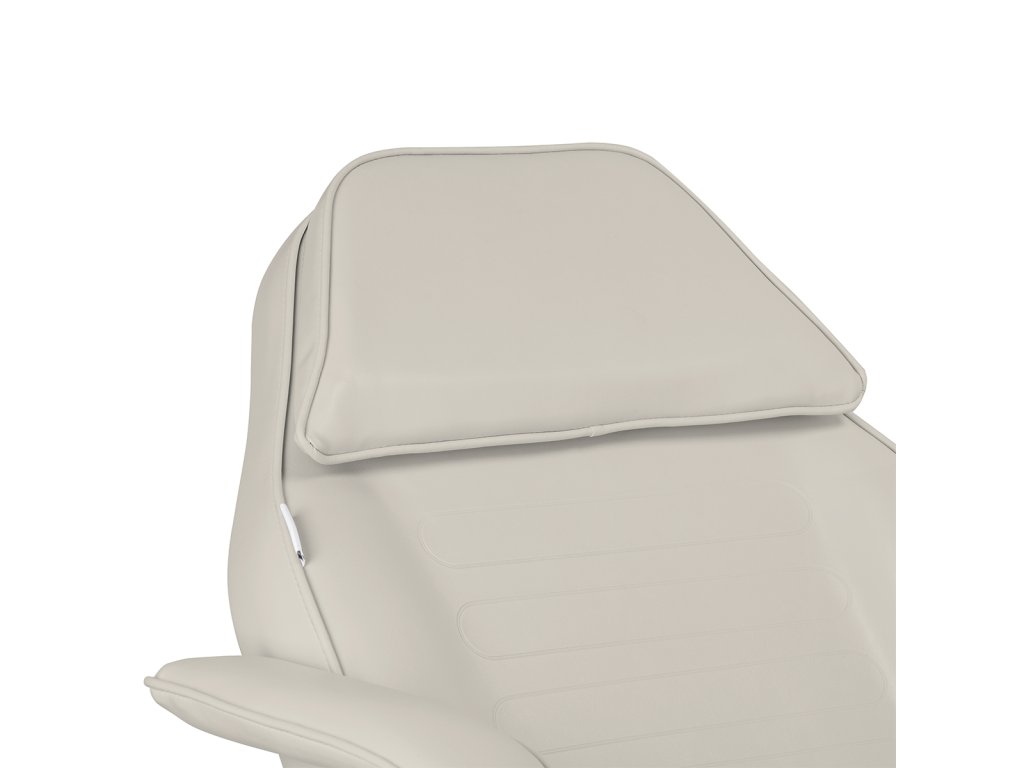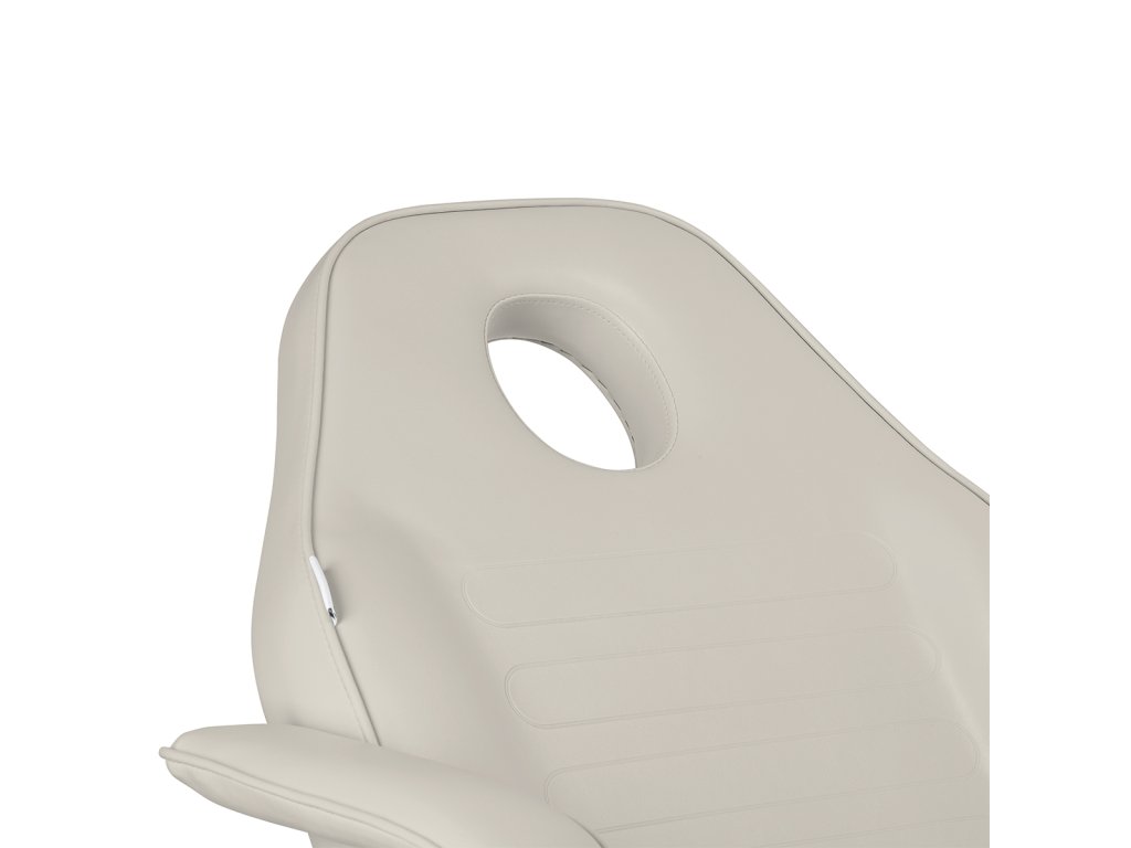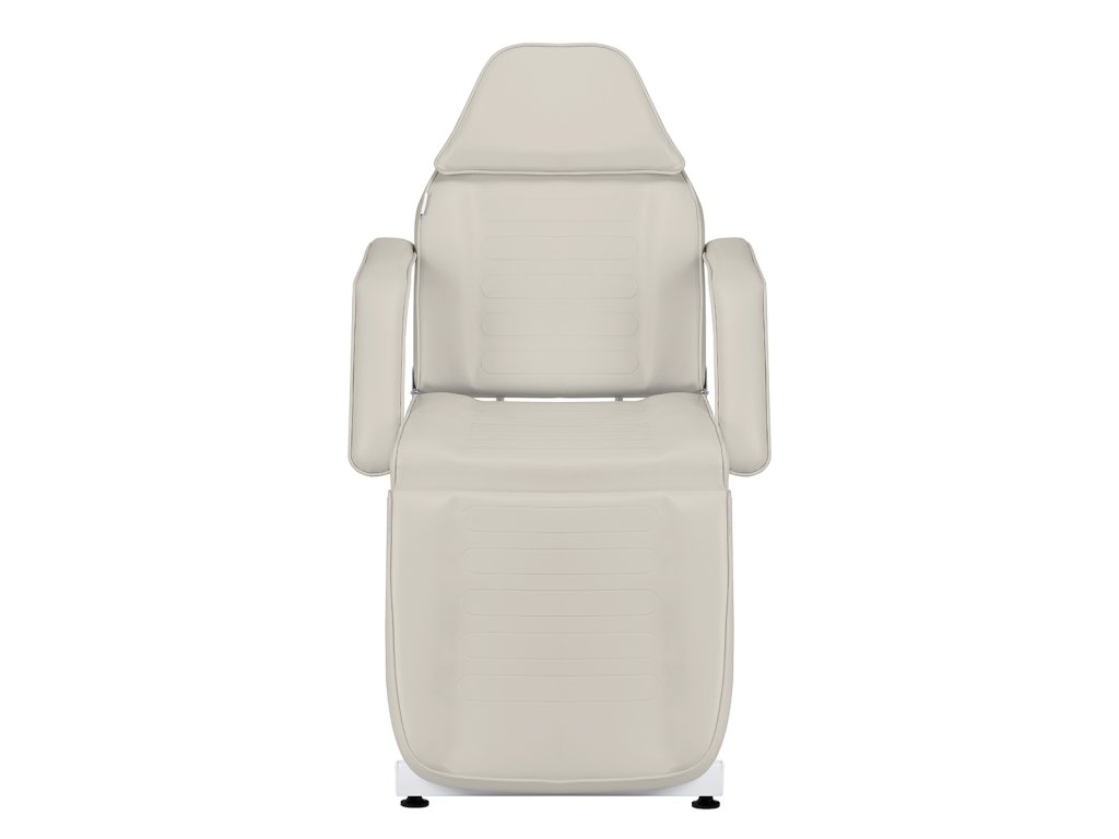 Čalounění ve světle béžové barvě je vyrobeno ze syntetické kůže, která je odolná proti vlhkosti a snadná na čištění, což usnadňuje udržování hygieny v profesionálním provozu. Pohodlné polstrování z elastické pěny poskytuje komfort i při delších kosmetických či relaxačních úkonech. Odnímatelné područky zajišťují flexibilitu při práci a lepší přístup k tělu klienta.