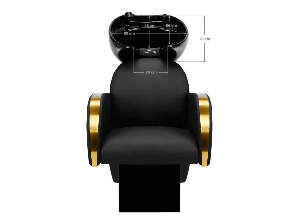 Správně profilované křeslo vyplněné odolnou pěnou zajišťuje vysoký komfort používání a elegantní područky umožňují správné umístění klientových ramen . Opěrka zad je umístěna v optimálním úhlu a umožňuje zaujmout správnou polohu a poskytuje vynikající oporu vaší páteři . Černý kryt a ozdobné zlaté lakované kovové povrchy mu dodávají nadčasovou eleganci a navíc zaručují dlouhodobou odolnost a snadné čištění. Díky klasickému provedení myčky vypadá skvěle téměř v každém prostoru . Sada obsahuje kompletní armatury v odstínech černé, včetně baterie, sprchové hlavice a speciálních hadic, které poskytují kompletní sadu pro práci .