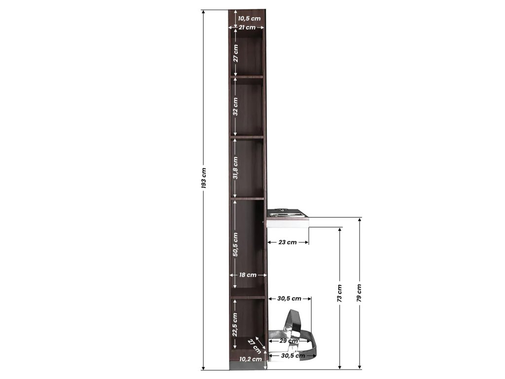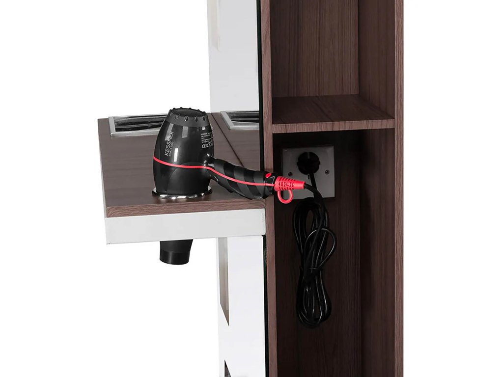 Moderní kadeřnická konzole s velkým zrcadlem a praktickými policemi na obou stranách. Obsah polic na jedné straně je viditelný skrz „tabule“. Špičková povrchová úprava. Elegantní a zároveň univerzální prvek interiéru, který podtrhne charakter každého kadeřnického salónu.