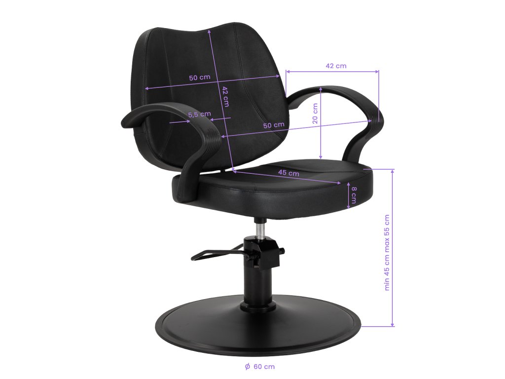 Kadeřnické křeslo Classic Black v elegantním černém provedení je ideální volbou pro salony, které hledají spojení komfortu, odolnosti a moderního vzhledu. Díky hydraulickému zdvihu s plynulou regulací výšky v rozmezí 45–55 cm lze snadno přizpůsobit pracovní podmínky potřebám kadeřníka i pohodlí klienta. Výšku je možné nastavit i během sezení, což zajišťuje maximální flexibilitu a ergonomii při práci.