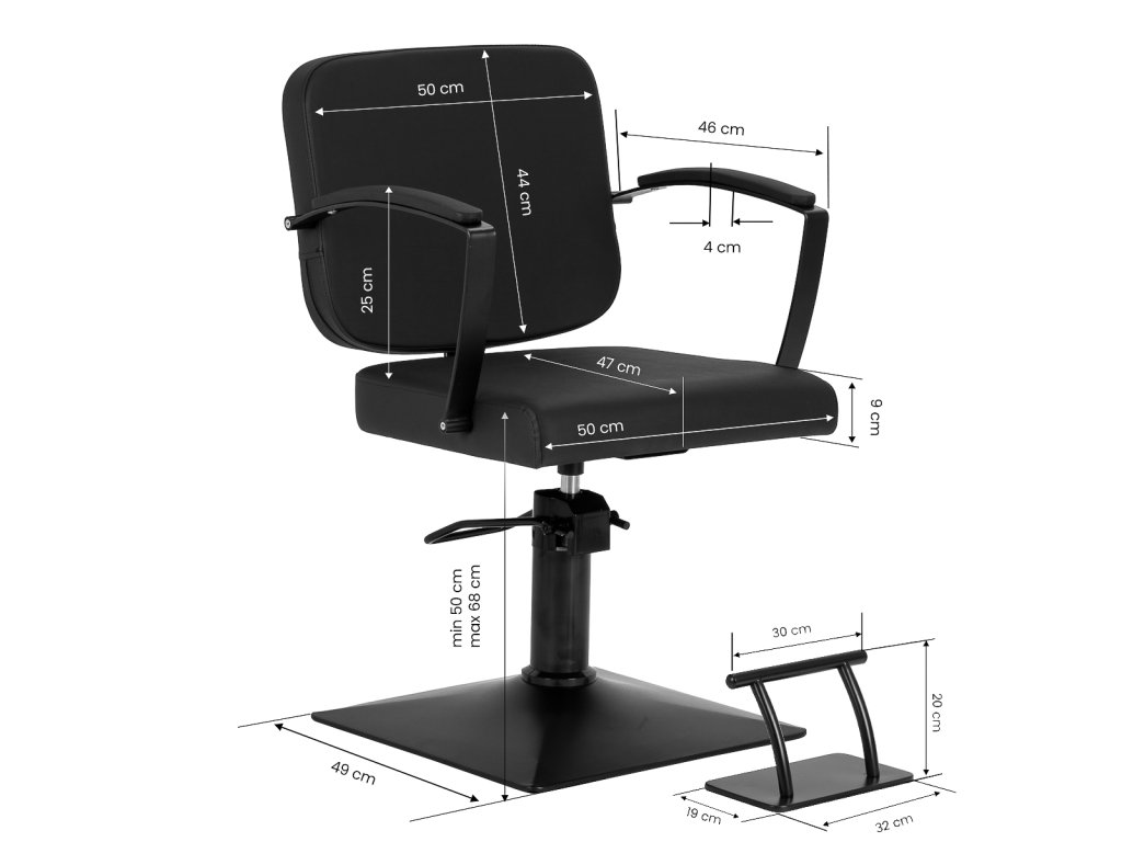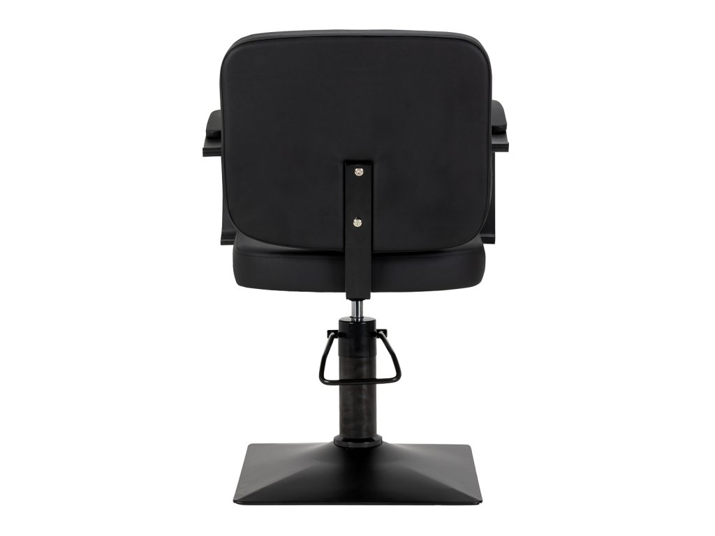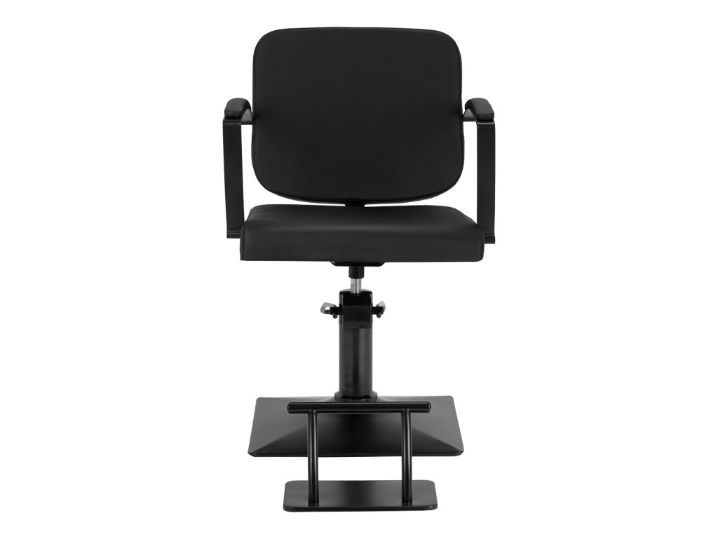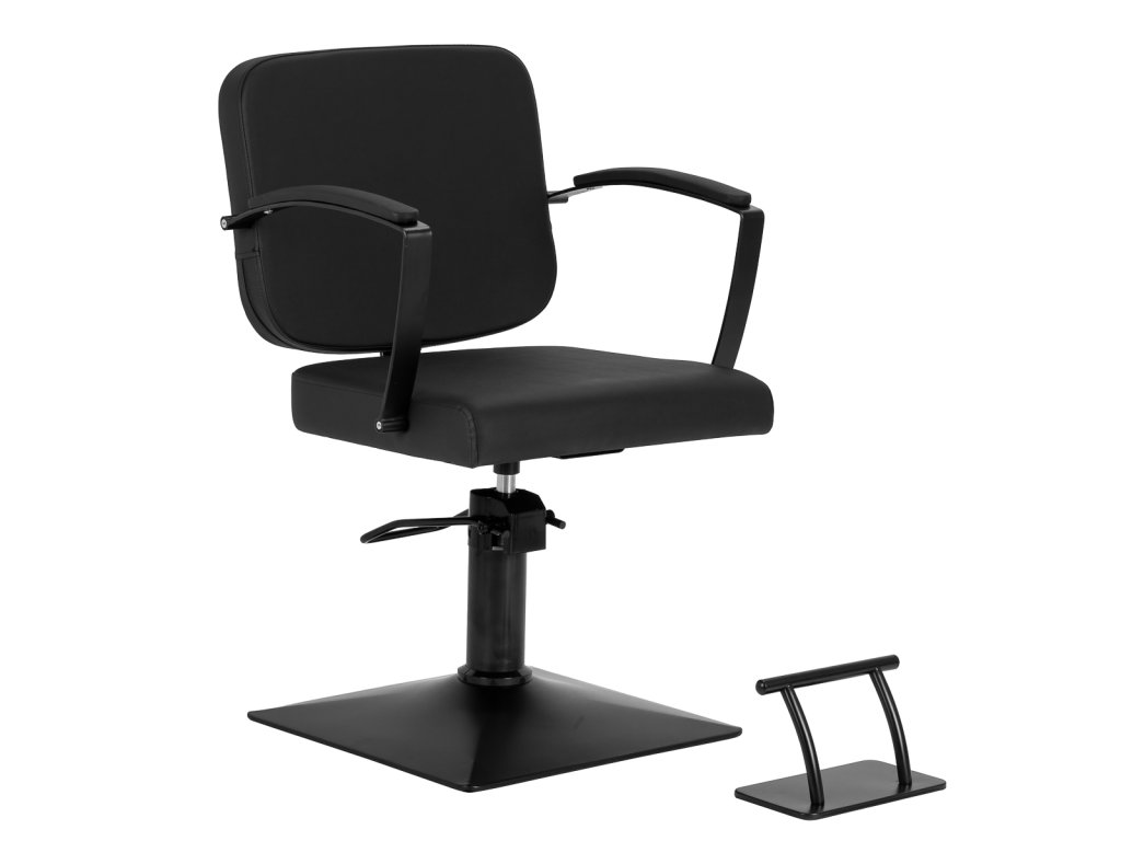 Pevná čtvercová základna zajišťuje vysokou stabilitu a díky hladkému povrchu se snadno udržuje v čistotě. Elegantní čalouněné područky s ergonomickým tvarem jsou umístěny v optimální výšce, aby klient seděl přirozeně a pohodlně. To přispívá k plynulému průběhu práce a umožňuje kadeřníkovi maximální přesnost v každé fázi služby.