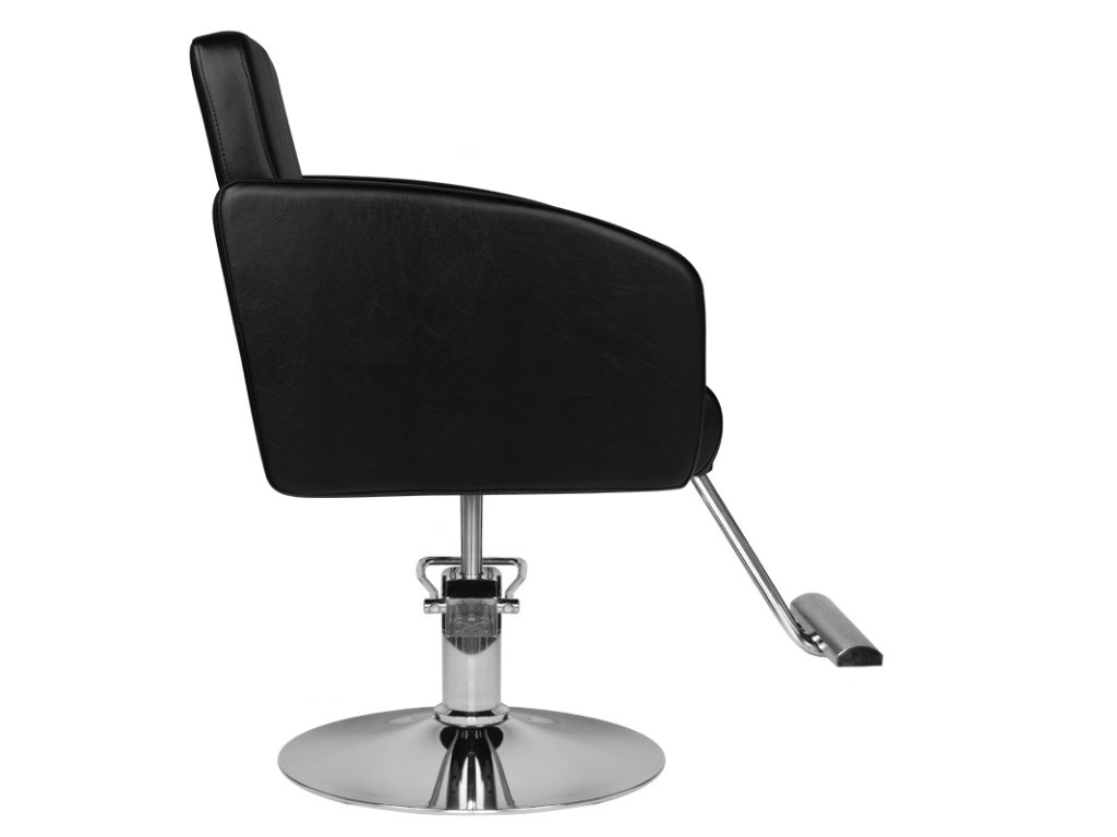 Moderní kadeřnické křeslo značky HAIR SYSTEM. Elagantní a velmi pohodlné. Pevný chromovaný podstavec zaručuje stabilitu sedadla. Potah je vyroben z vysoce kvalitní černé ekokože. Židle je nastavitelná nahoru a dolů