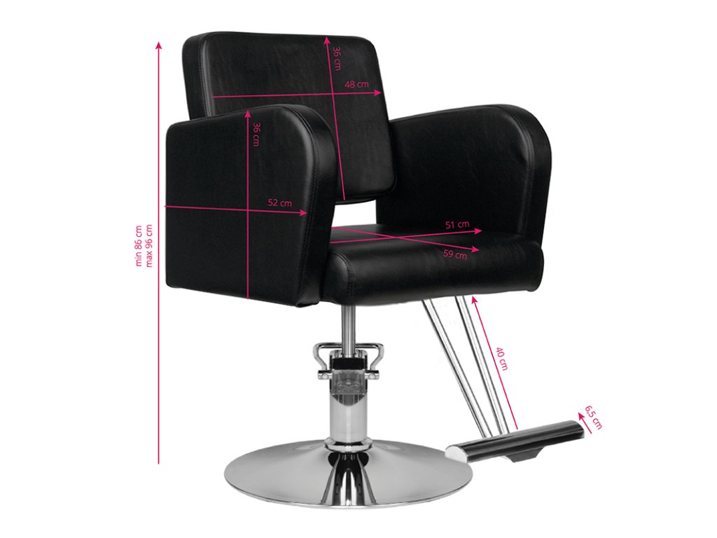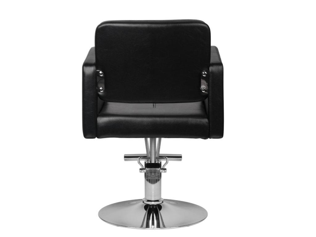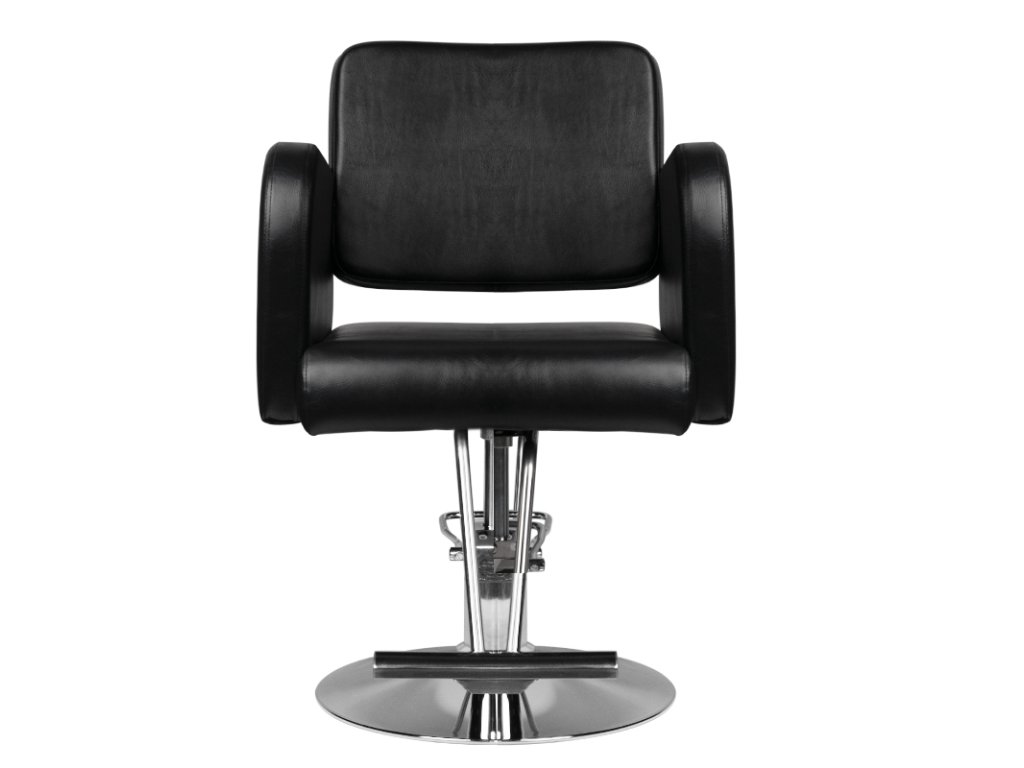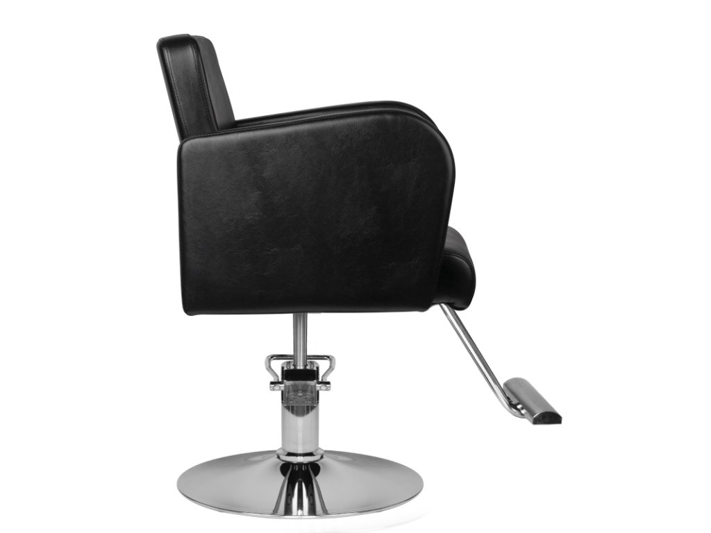 Moderní kadeřnické křeslo značky HAIR SYSTEM. Elagantní a velmi pohodlné. Pevný chromovaný podstavec zaručuje stabilitu sedadla. Potah je vyroben z vysoce kvalitní černé ekokože. Židle je nastavitelná nahoru a dolů