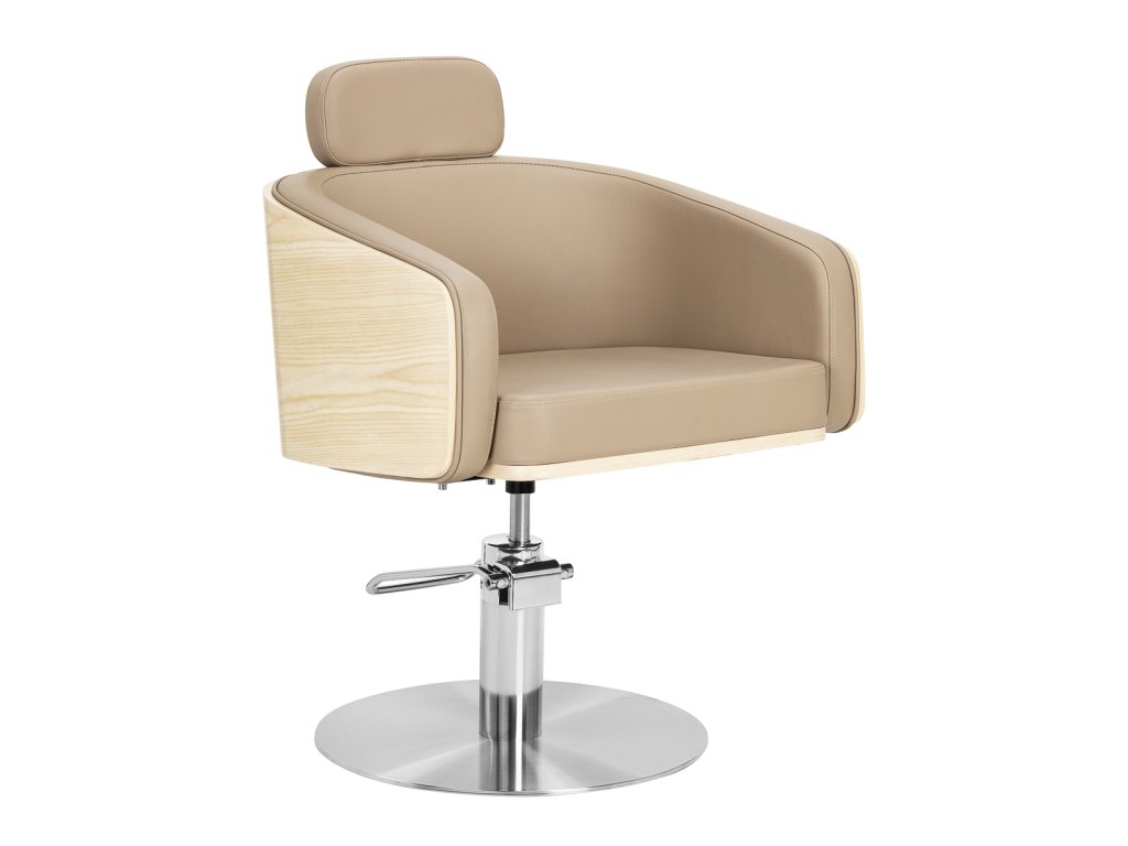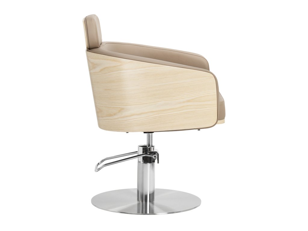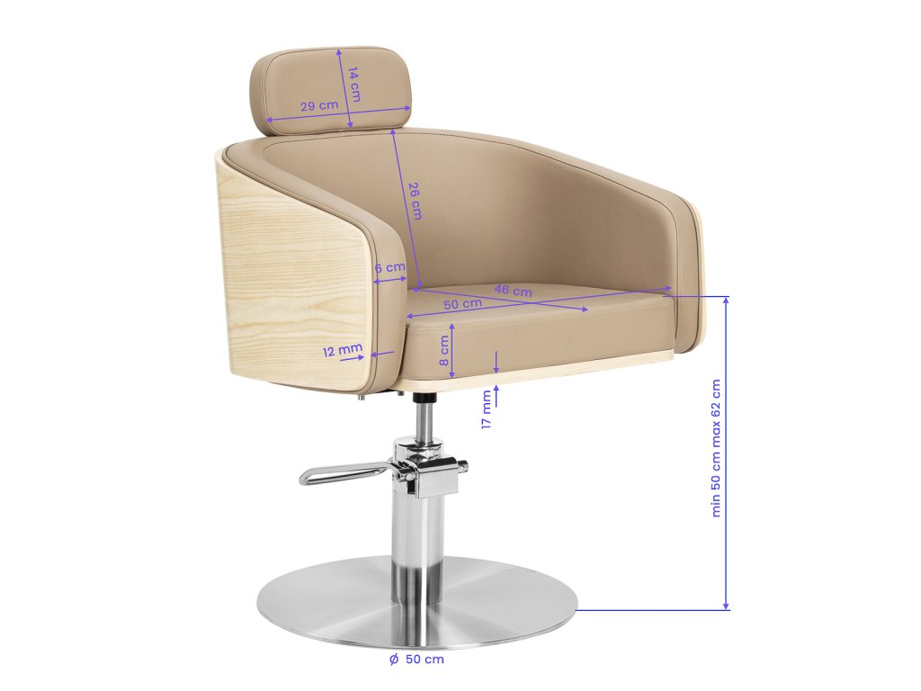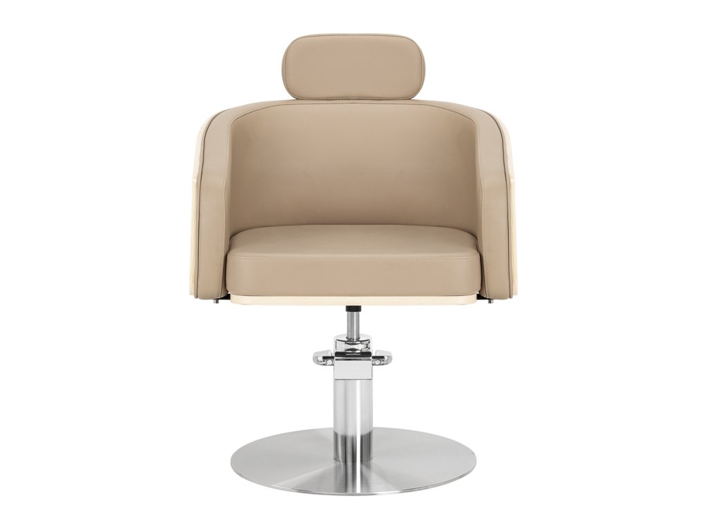 Sedadlo je vybaveno měkkou pěnovou výplní a ergonomickým tvarováním, které poskytuje stabilní oporu zad i při dlouhotrvajících úpravách. Povrch tvoří kvalitní syntetická kůže v odstínu taupe, která je příjemná na dotek, snadno se čistí a dobře odolává vlhkosti i chemickým přípravkům.