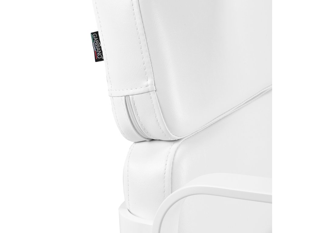 Čalounění v bílé barvě je vyrobeno z kvalitní syntetické kůže, která je příjemná na dotek, odolná proti vlhkosti a nenáročná na údržbu. Výplň z pevné pěny garantuje dlouhodobý komfort a tvarovou stálost. Kovové područky v bílé barvě a samostatný podnožník přispívají k maximálnímu pohodlí klienta.