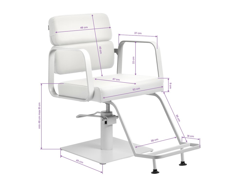 Díky hydraulickému zdvihu s rozsahem 49–61 cm lze výšku křesla snadno přizpůsobit potřebám kadeřníka i klienta, a to i během sezení. Plný otočný mechanismus usnadňuje práci a zvyšuje efektivitu při každodenních úpravách.