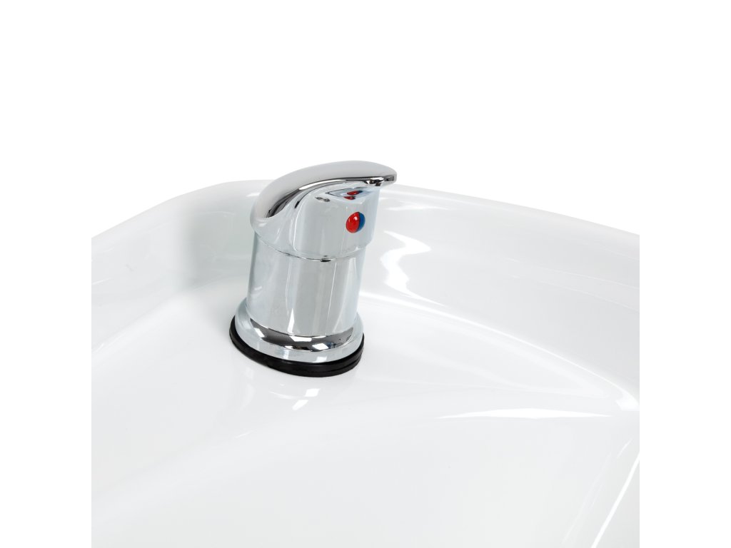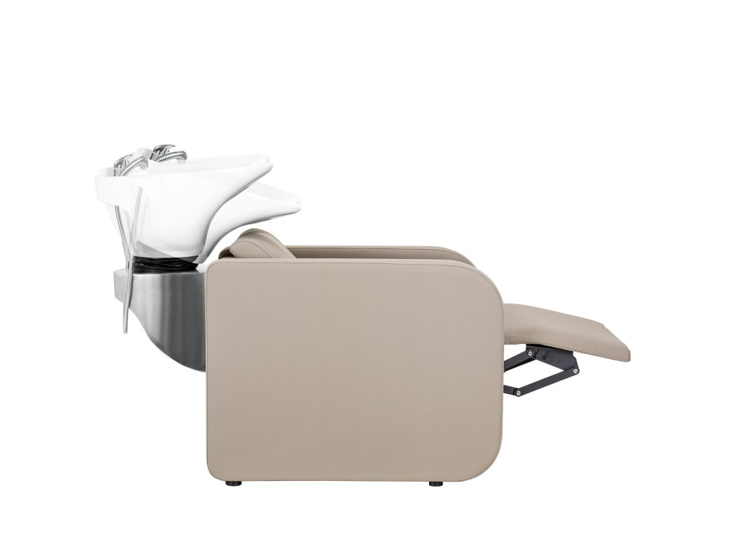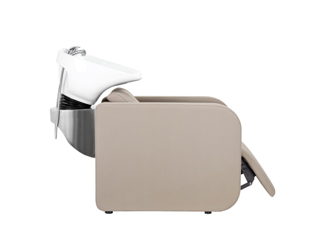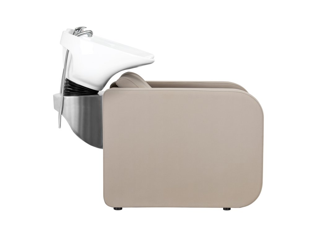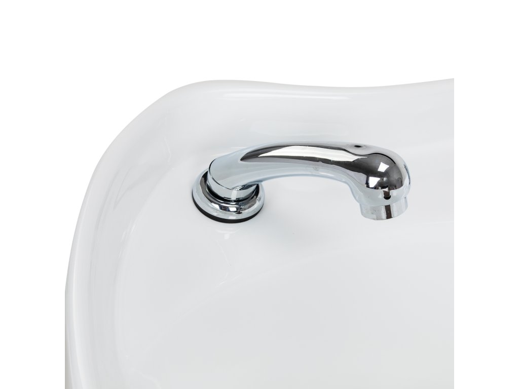 Hluboká keramická mísa v bílém odstínu je vysoce odolná vůči poškrábání a zabarvení, snadno se čistí a zabraňuje nechtěnému rozstřiku vody. Ergonomický tvar košíře i měkká černá podložka pod krk poskytují klientovi maximální pohodlí.