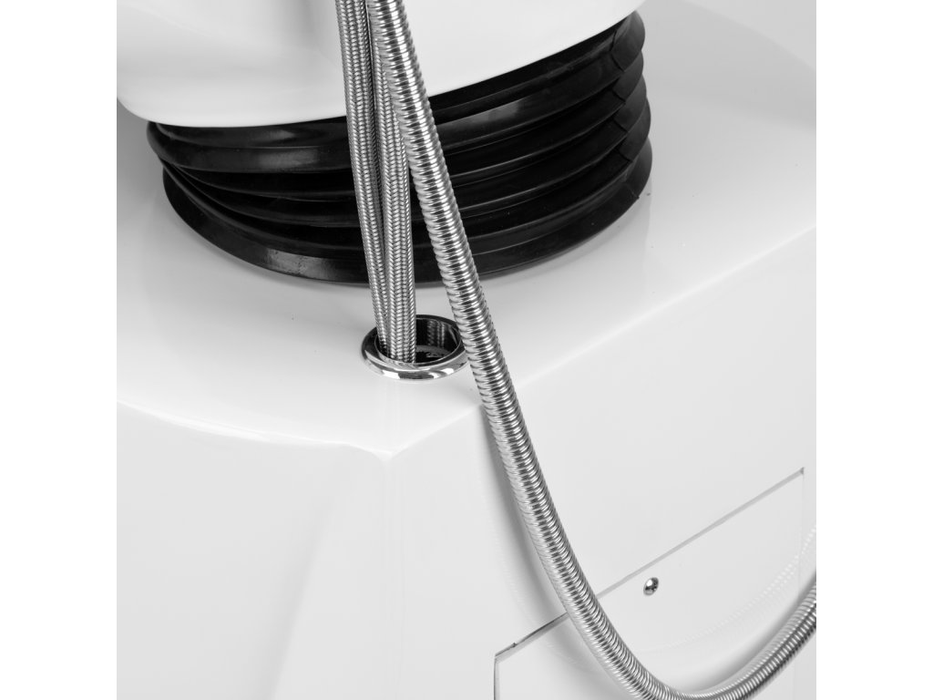 Praktický mycí box je vybaven baterií s směšovačem, která zajišťuje snadný přístup k teplé a studené vodě . To usnadňuje přizpůsobení teploty individuálním preferencím zákazníka. Vyhrazené místo pro zavěšení sprchy usnadňuje práci a chromovaná zátka se speciálním sítkem umožňuje regulovat průtok vody a udržovat v salonu vysoké hygienické standardy. Vodovodní přípojka je umístěna uvnitř základny , což umožňuje snadné skrytí potrubí. Významnou výhodou tohoto modelu je ponechaný otvor mezi opěradlem a sedákem , který usnadňuje udržování čistoty v salonu tím, že umožňuje snadné vymést nečistoty z každého koutu křesla. Mycí box byl navržen tak, aby zajistila pohodlí při různých ošetřeních a zajistila dostatečnou oporu zad . Díky kombinaci funkčnosti a vybavení je práce v kadeřnickém salonu ještě pohodlnější .