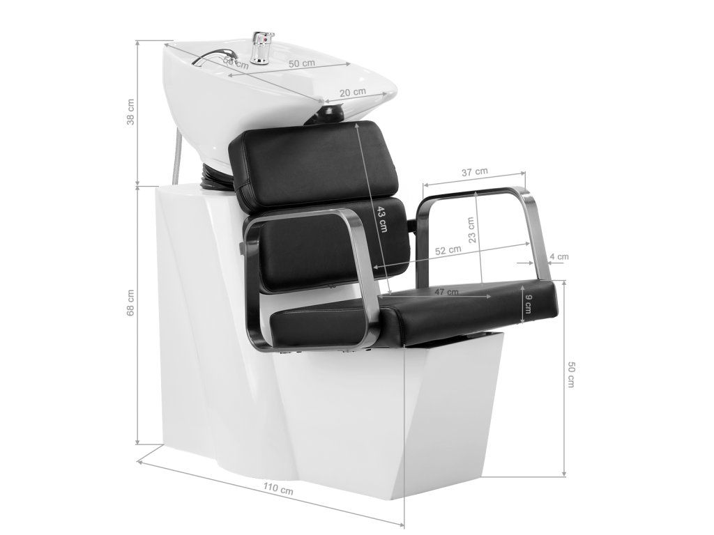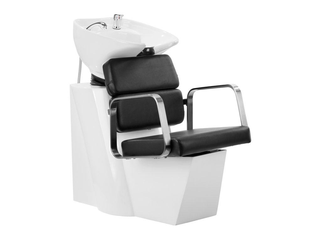 Tvarované křeslo poskytuje přiměřenou bederní oporu a tím i vysoký komfort používání. Kovové područky v odstínech chromu s geometrickým tvarem umožňují správné umístění ramen zákazníka . Výplň z odolné pěny odolné proti deformaci a čalounění z na dotek příjemné syntetické kůže v odstínech černé zajišťují odolnost nábytku, snadné čištění a pohodlné používání po dlouhou dobu . Originální elegantní vzhled mycího boxu dodává interiéru jedinečný výraz. Sada obsahuje kompletní armatury v odstínech chromu, včetně baterie, sprchové hlavice a speciálních hadic, které poskytují kompletní sadu pro práci .