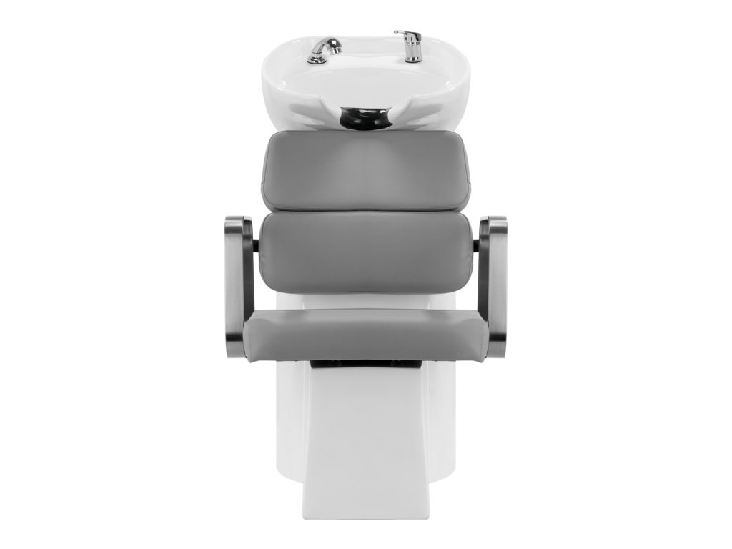 Tvarované křeslo poskytuje přiměřenou bederní oporu a tím i vysoký komfort používání. Kovové područky v odstínech chromu s geometrickým tvarem umožňují správné umístění ramen zákazníka . Výplň z odolné pěny odolné proti deformaci a čalounění z na dotek příjemné syntetické kůže v odstínech šedé zajišťují odolnost nábytku, snadné čištění a pohodlné používání po dlouhou dobu . Originální elegantní vzhled mycího boxu dodává interiéru jedinečný výraz. Sada obsahuje kompletní armatury v odstínech chromu, včetně baterie, sprchové hlavice a speciálních hadic, které poskytují kompletní sadu pro práci .