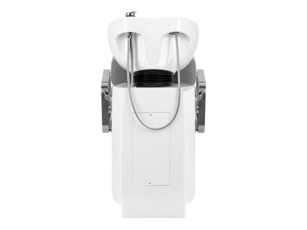 Praktický mycí box je vybaven baterií s směšovačem, která zajišťuje snadný přístup k teplé a studené vodě . To usnadňuje přizpůsobení teploty individuálním preferencím zákazníka. Vyhrazené místo pro zavěšení sprchy usnadňuje práci a chromovaná zátka se speciálním sítkem umožňuje regulovat průtok vody a udržovat v salonu vysoké hygienické standardy. Vodovodní přípojka je umístěna uvnitř základny , což umožňuje snadné skrytí potrubí. Významnou výhodou tohoto modelu je ponechaný otvor mezi opěradlem a sedákem , který usnadňuje udržování čistoty v salonu tím, že umožňuje snadné vymést nečistoty z každého koutu křesla. Mycí box byl navržen tak, aby zajistil pohodlí při různých ošetřeních a zajistil dostatečnou oporu zad . Díky kombinaci funkčnosti a vybavení je práce v kadeřnickém salonu ještě pohodlnější .