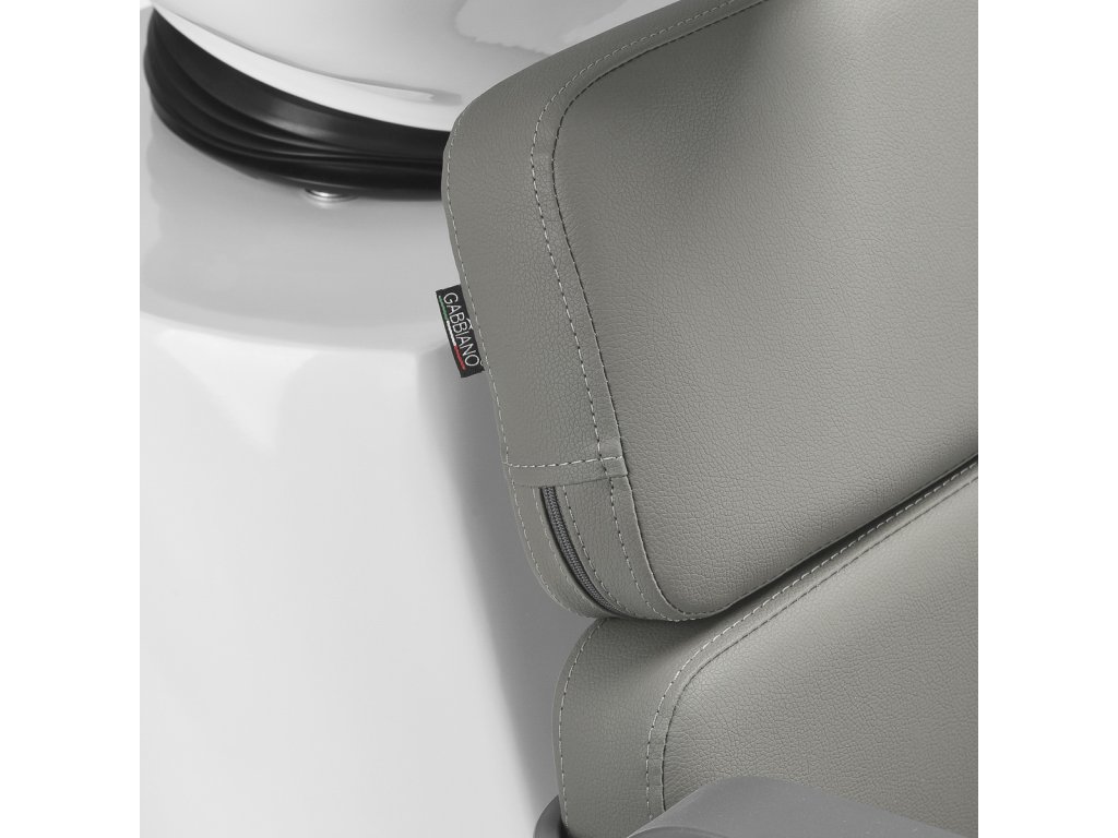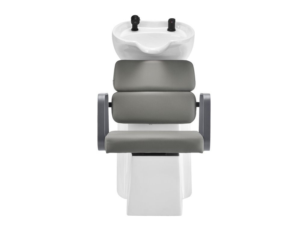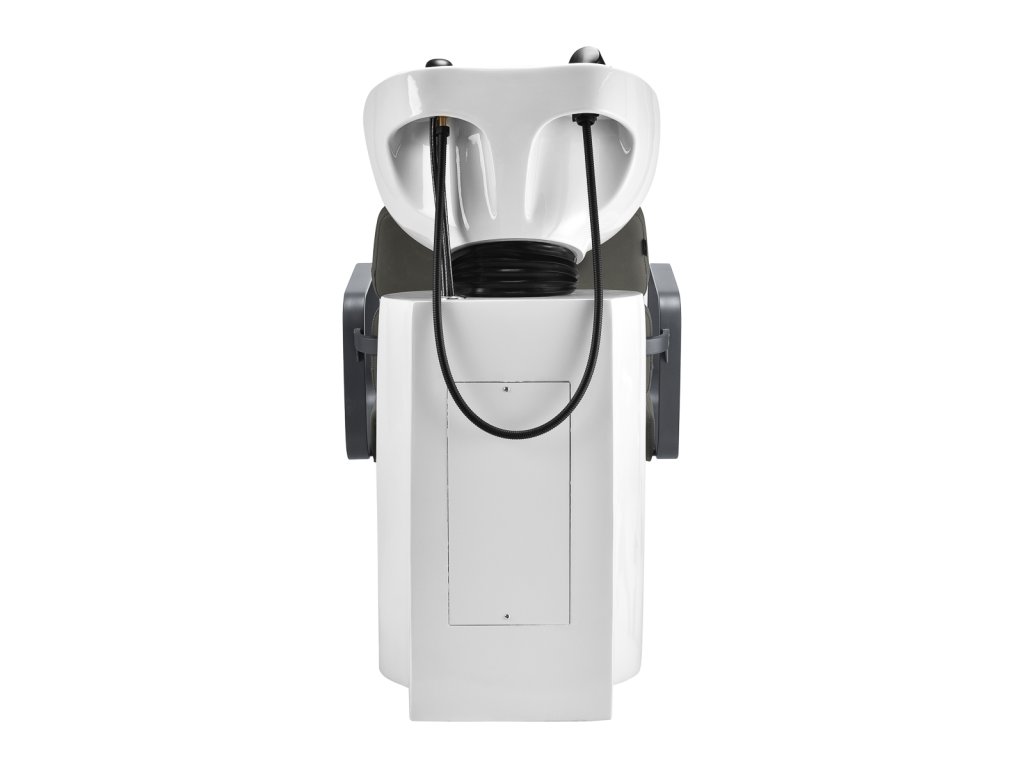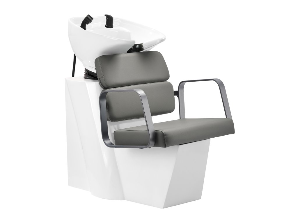 Jedním z hlavních prvků je bílá keramická mísa, která vyniká svou odolností proti poškození, skvrnám i poškrábání. Díky nastavitelnosti sklonu se snadno přizpůsobí individuálním potřebám klienta i stylisty. Ergonomicky tvarovaný krk a přidaná černá opěrka z příjemného materiálu eliminují nepříjemný chlad keramiky, čímž zvyšují komfort při mytí vlasů.