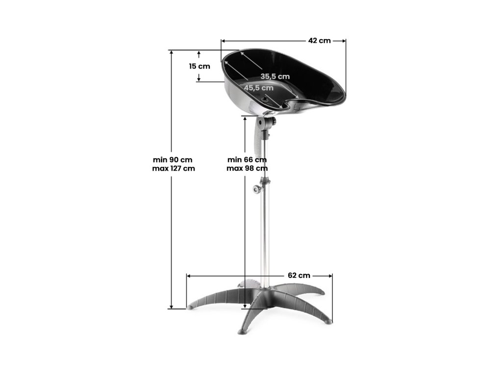 Přenosný mycí box je vyroben z vysoce kvalitního plastu, který lze snadno odplavit od zbytků barvy a vlasů. Mísa ostřikovače má navíc pohodlné nastavení úhlu sklonu pomocí šroubu a odtokového otvoru s hadicí pro vypouštění vody.