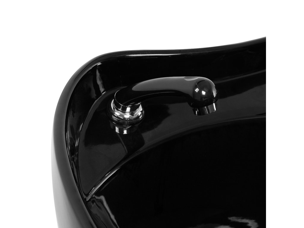 Černé keramické umyvadlo má optimální hloubku, která pomáhá omezit rozstřik vody a produktů. Regulace sklonu umyvadla se snadno přizpůsobí různým potřebám, čímž se zvyšuje pohodlí klienta i efektivita práce kadeřníka. Kvalitní keramika je odolná vůči poškrábání, skvrnám a snadno se čistí. Měkká plastová opěrka zabraňuje nepříjemnému pocitu chladu na krku.
