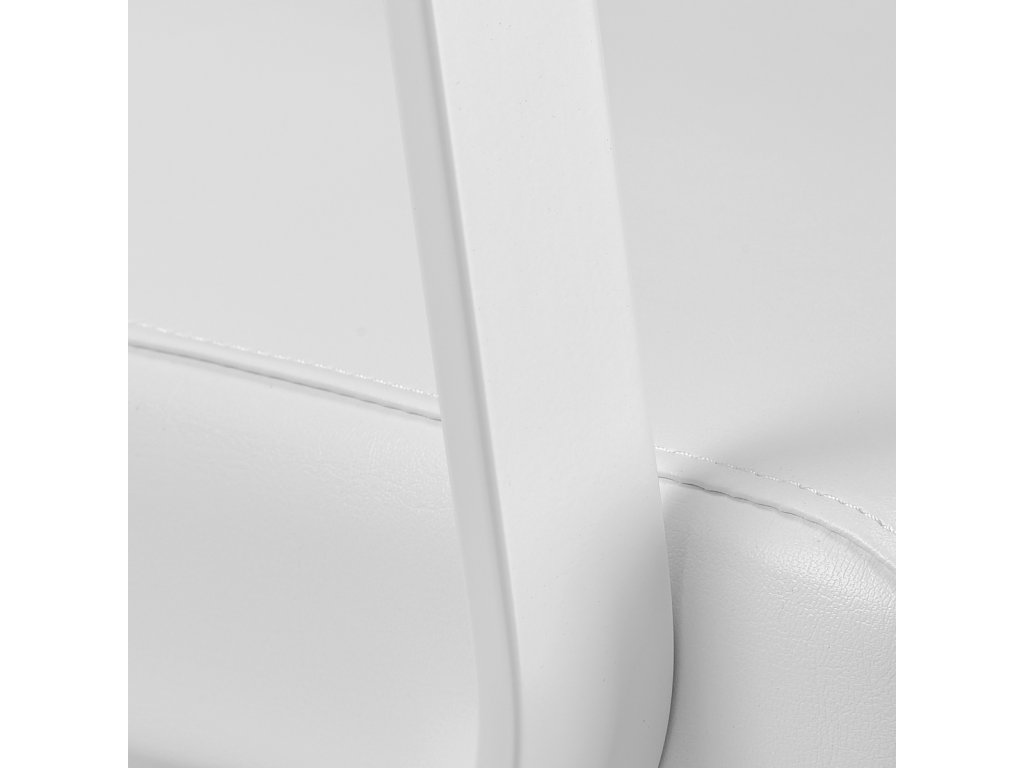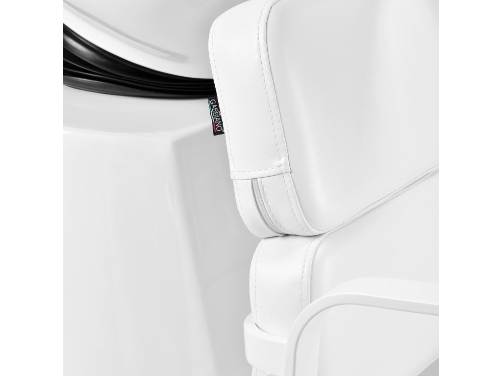 Čalounění v bílé barvě je vyrobeno z odolné syntetické kůže, která se snadno čistí a je příjemná na dotek. Pevná pěnová výplň zaručuje dlouhodobý komfort a stabilitu tvaru i při intenzivním používání. Černé kovové područky poskytují klientovi oporu a zvyšují celkový komfort při ošetření.