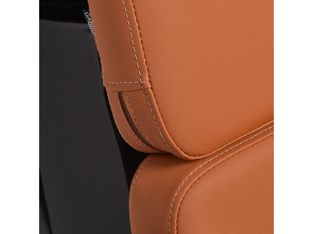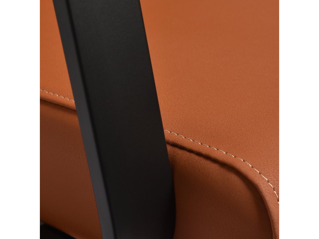 Čalounění v pomerančovém odstínu je vyrobeno z kvalitní syntetické kůže, která je příjemná na dotek, snadno se čistí a je odolná proti opotřebení. Výplň z pevné pěny poskytuje dlouhou životnost a komfort i při častém používání. Kovové područky v černém designu přispívají k pohodlnému sezení a správné opoře ramen.