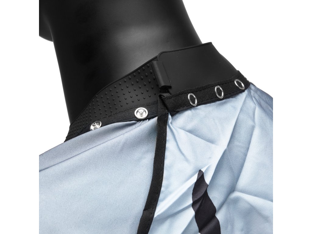Výrobek je vyroben z černého nepromokavého materiálu, který umožňuje snadné čištění a dostatečně chrání před všemi druhy postříkání. Díky univerzální velikosti a možnosti nastavení díky patentkám u krku poslouží každému klientovi bez ohledu na jeho výšku a zajistí pohodlí během prováděného ošetření.