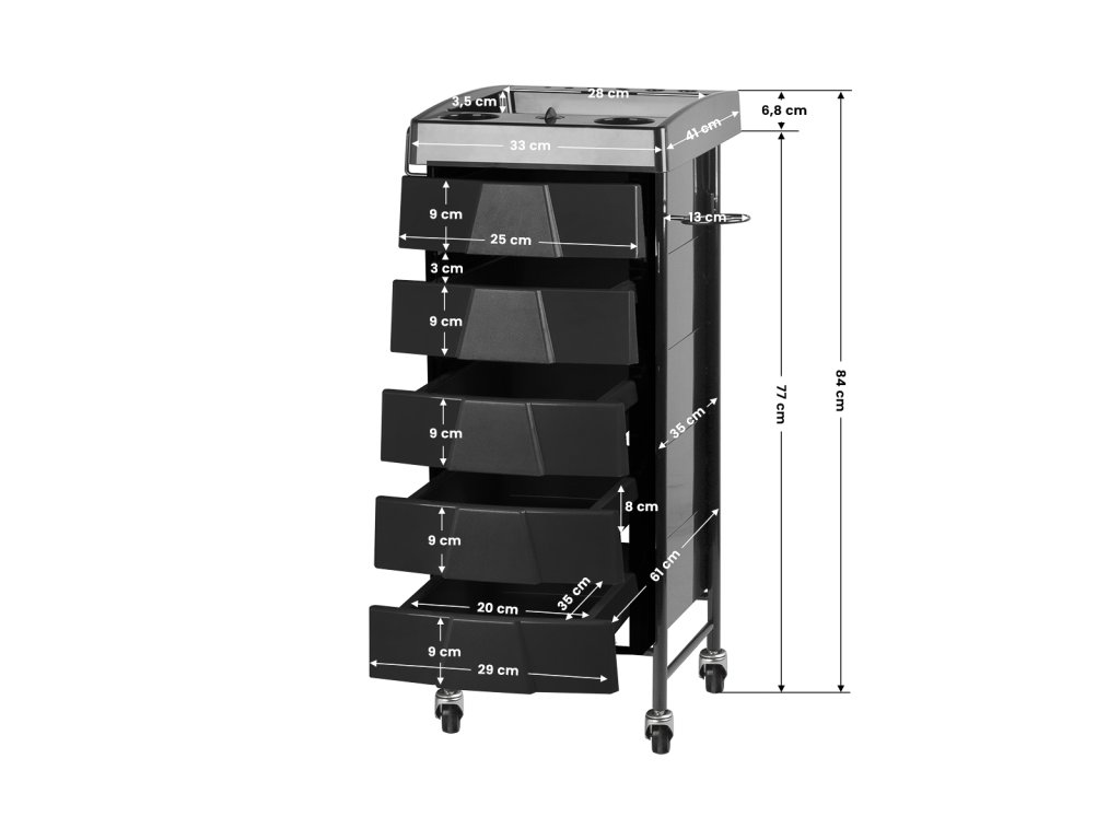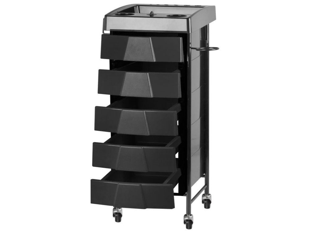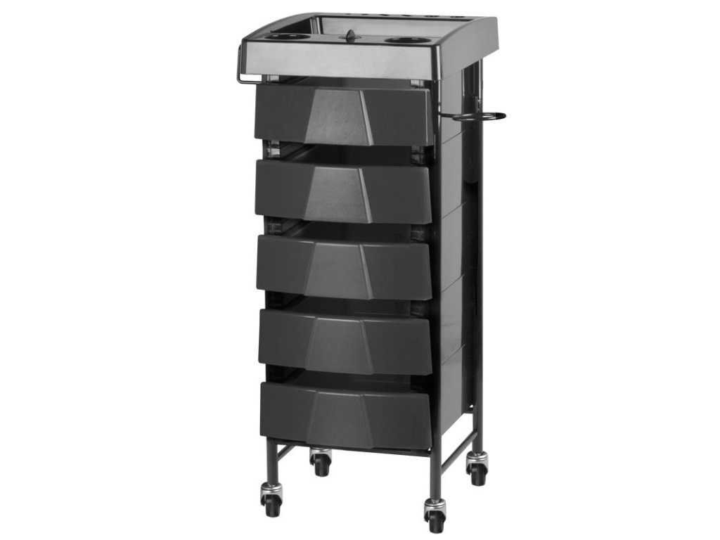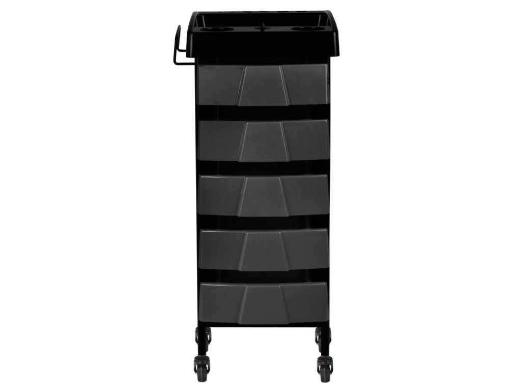 Oboustranný kadeřnický vozík v černé barvě, má 5 beden, 7 přihrádek a 2 držáky pro kadeřnický sortiment. Stabilní konstrukce zajistí dlouhodobé používání. Kadeřnický vozík je upevněn na gumových kolečkách, díky nimž budete mít nářadí vždy po ruce.