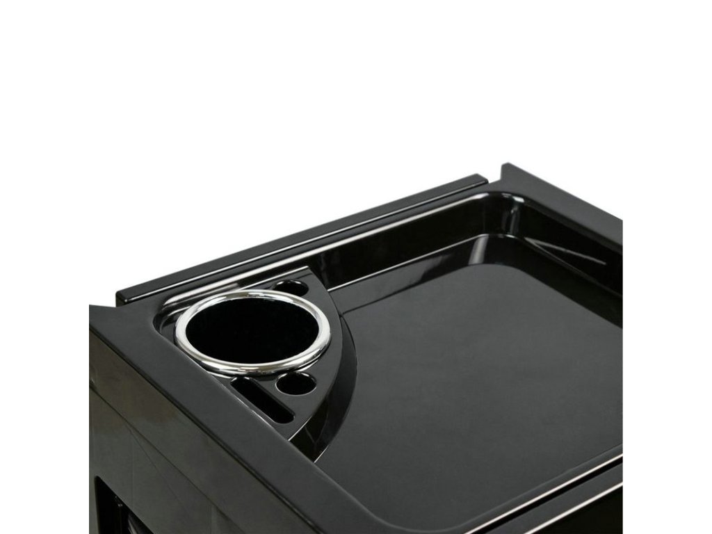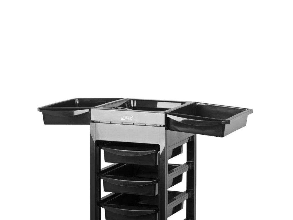 Oboustranný kadeřnický vozík v černé barvě, má 5 boxů na odpadky a přihrádky na kadeřnický sortiment. Stabilní konstrukce zajistí dlouhodobé používání. Kadeřnický vozík připevněný na kolečkách, díky kterému budete mít nářadí vždy po ruce.