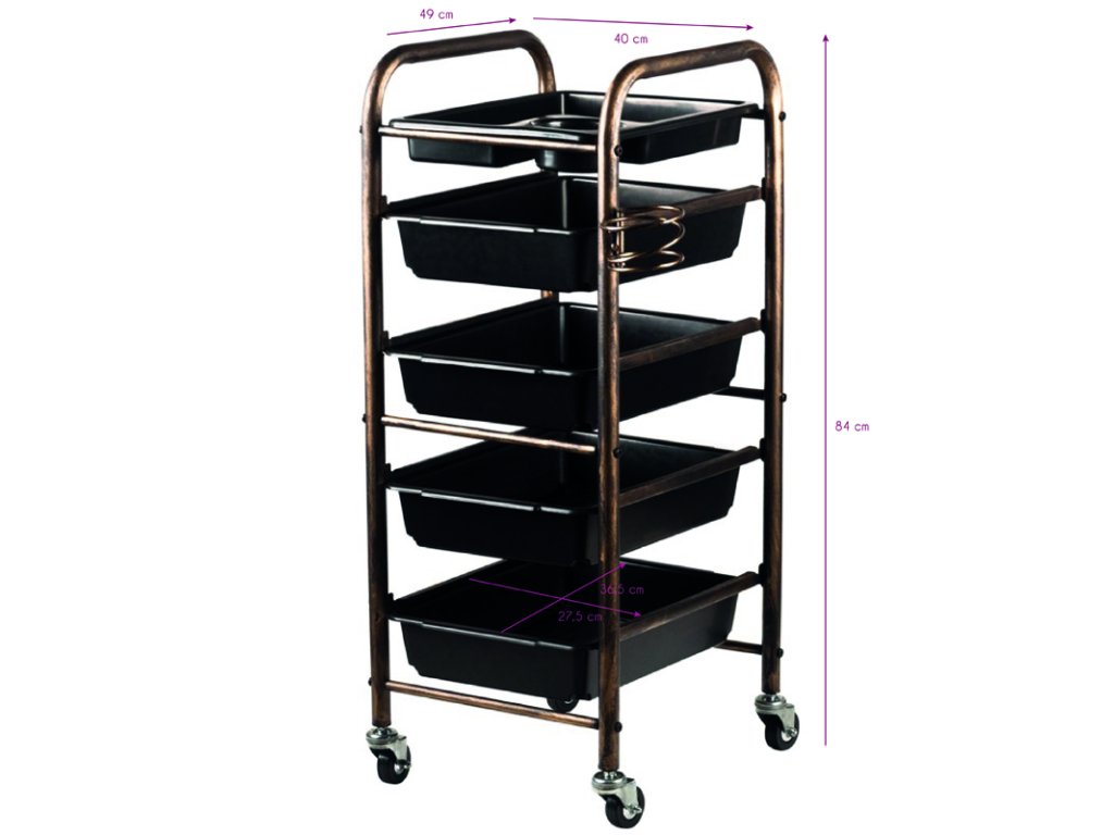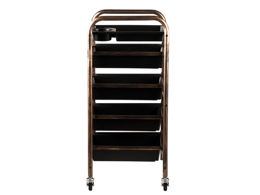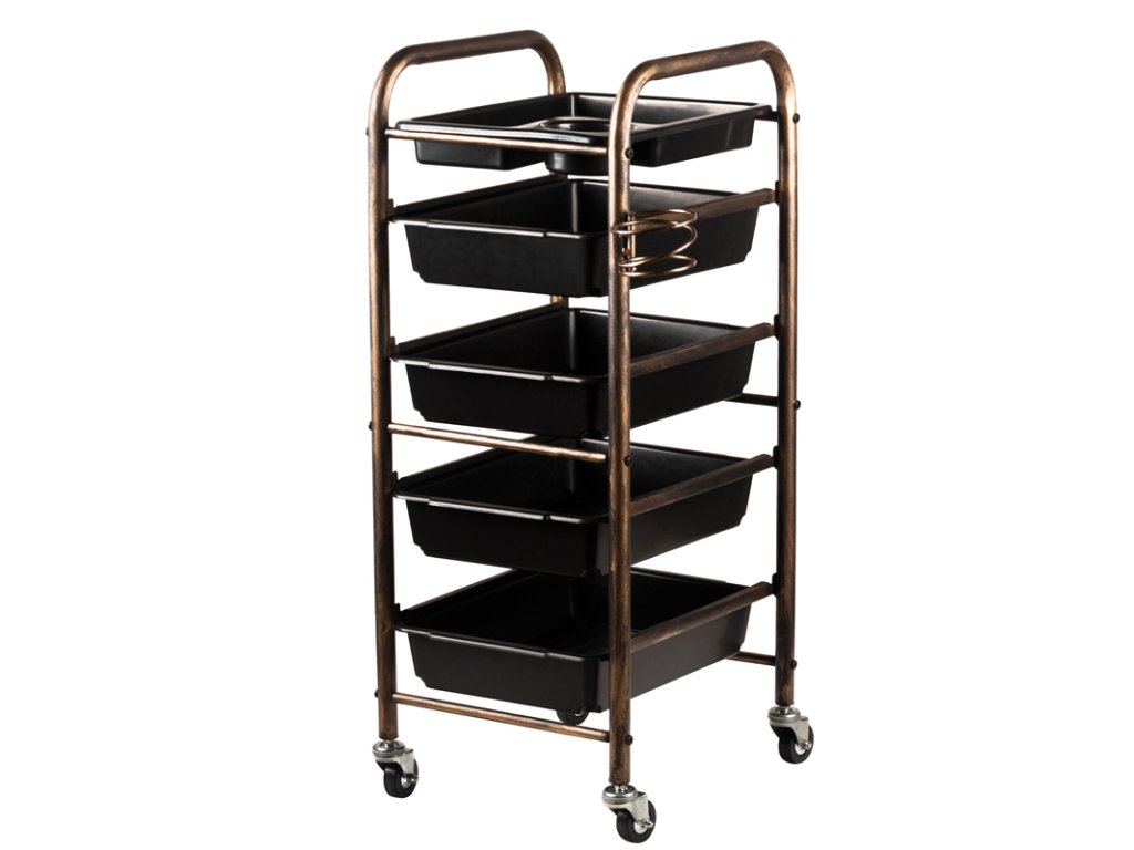 Oboustranný kadeřnický vozík v barvě starého zlata má 4 bedničky a držáky na holičský sortiment. Stabilní konstrukce zajistí dlouhodobé používání. Vozík je upevněn na gumových kolečkách, díky nimž budete mít nářadí vždy po ruce.
