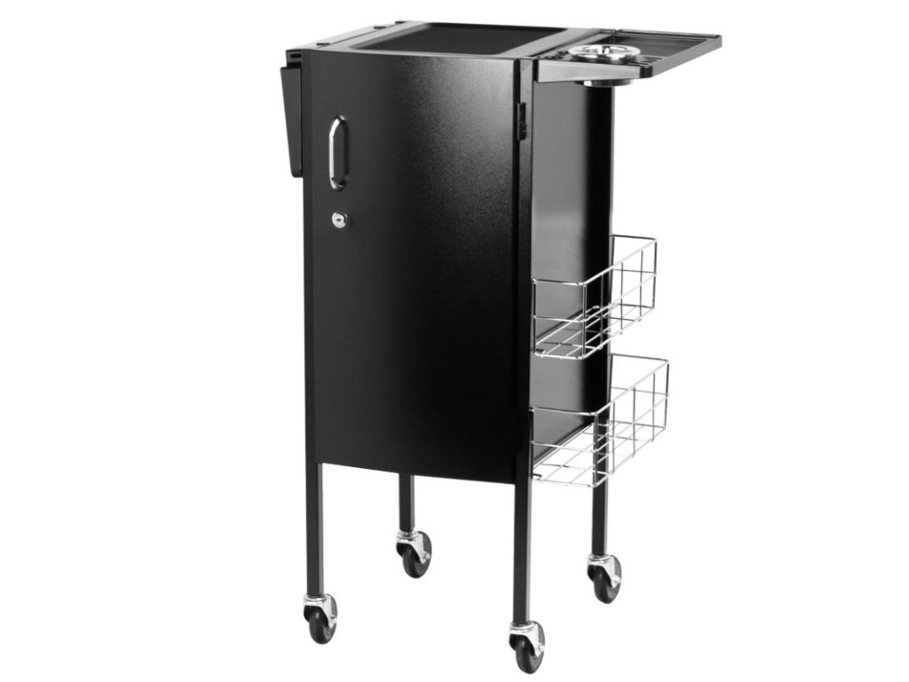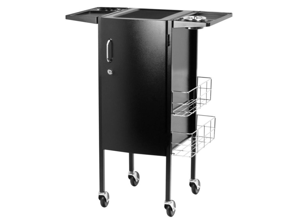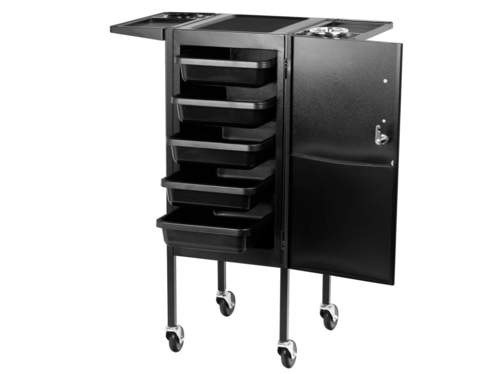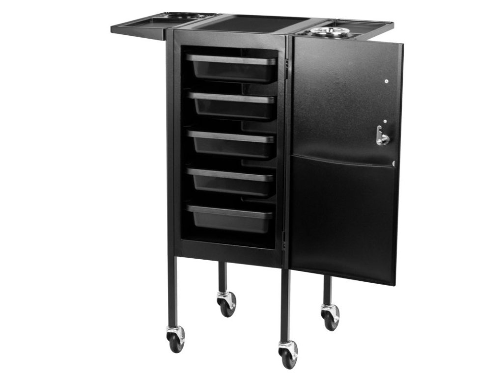 Elegantní kadeřnický vozík s uzamykatelnou skříní. Šikovný a především velmi prostorný. Má 4 gumová kola. Na obou stranách skříně jsou kovové koše na praktické příslušenství. Ve skříni je 5 prostorných zásuvek, které vám umožní třídit všechny malé věci. V horní části jsou dvě další skládané police s ražbou, do kterých lze stabilně umístit doplňky nebo ošetřovací přípravky. Perfektní kus nábytku pro každého kadeřníka, pro kterého se počítá vysoký komfort a estetika salonu.
