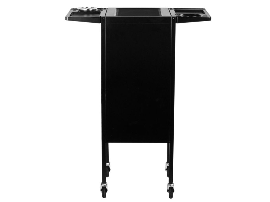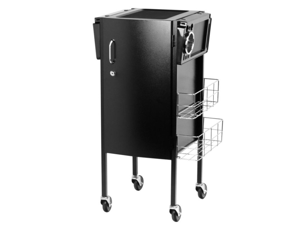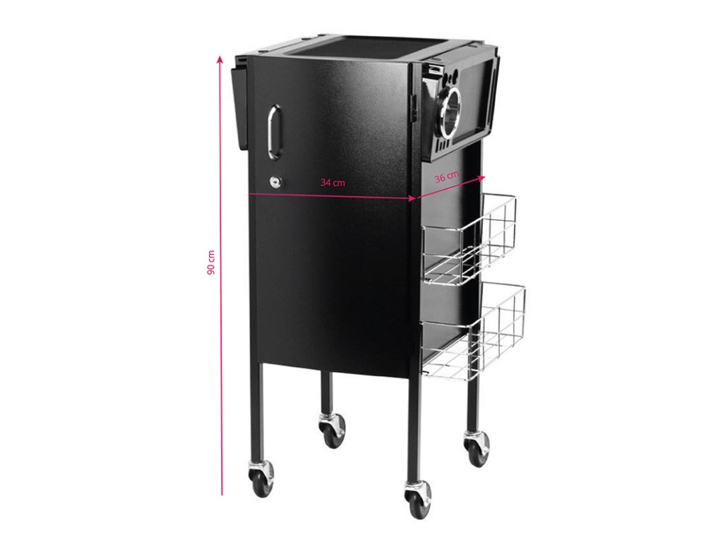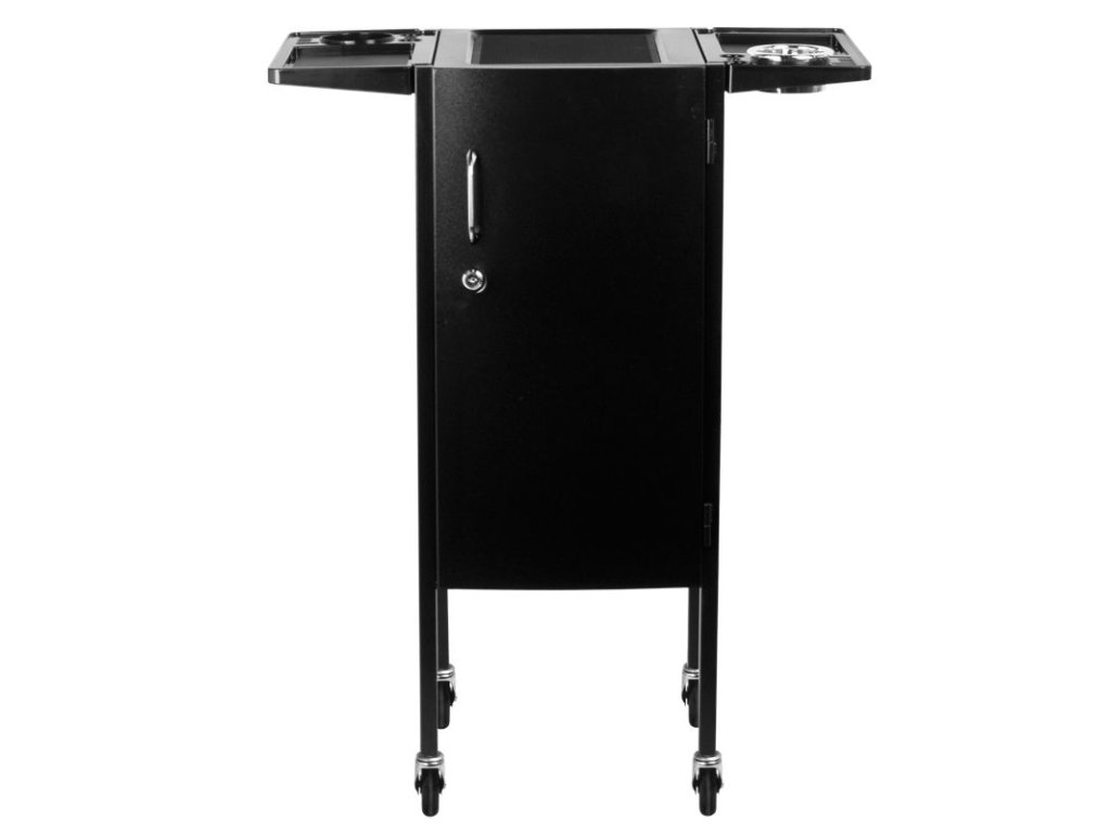 Elegantní kadeřnický vozík s uzamykatelnou skříní. Šikovný a především velmi prostorný. Má 4 gumová kola. Na obou stranách skříně jsou kovové koše na praktické příslušenství. Ve skříni je 5 prostorných zásuvek, které vám umožní třídit všechny malé věci. V horní části jsou dvě další skládané police s ražbou, do kterých lze stabilně umístit doplňky nebo ošetřovací přípravky. Perfektní kus nábytku pro každého kadeřníka, pro kterého se počítá vysoký komfort a estetika salonu.