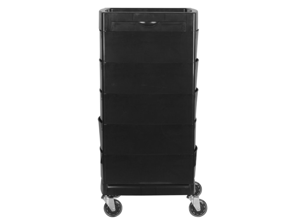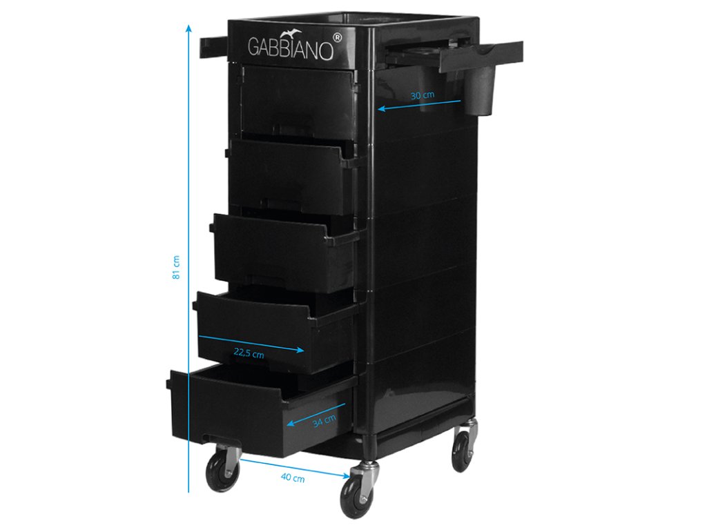 Kadeřnický vozík Gabbiano je vysoce kvalitní kus nábytku. Je vyroben z odolného ABS plastu s ocelovou konstrukcí rámu zajišťující vysokou stabilitu a odolnost. Celá věc je namontována na velmi odolných gumových kolech s kuličkovými ložisky. Dominantní černá barva rozbitá barvou zásuvek bude dokonale ladit s dekorem vašeho kadeřnického salonu.