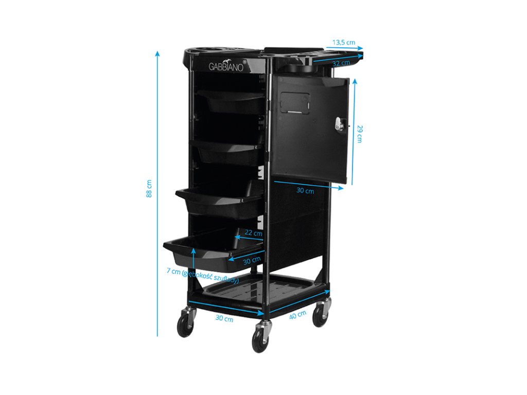 Kadeřnický vozík Gabbiano je vysoce kvalitní kus nábytku. Je vyroben z odolného ABS plastu s ocelovou konstrukcí rámu zajišťující vysokou stabilitu a odolnost. Celá věc je namontována na velmi odolných gumových kolech s kuličkovými ložisky. Dominantní černá barva rozbitá barvou zásuvek bude dokonale ladit s dekorem vašeho kadeřnického salonu.