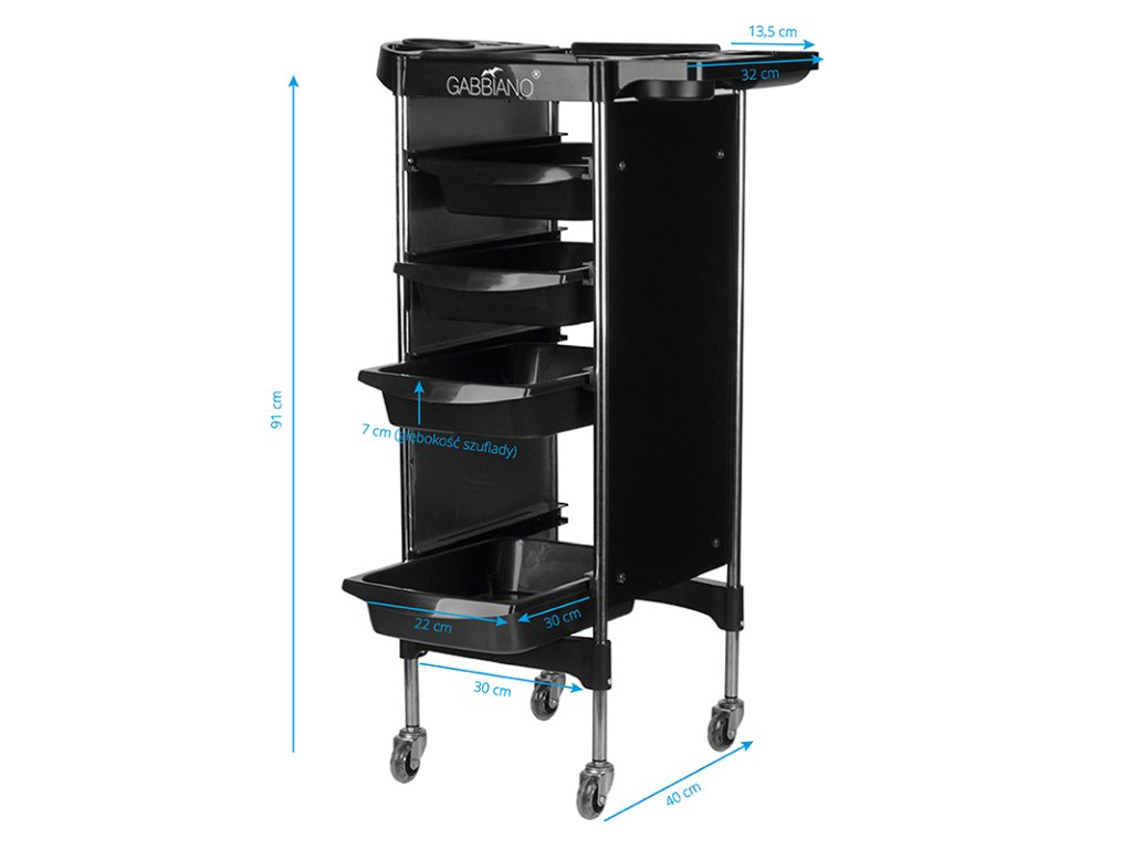 Kadeřnický vozík Gabbiano je vysoce kvalitní kus nábytku. Je vyroben z odolného ABS plastu s ocelovou konstrukcí rámu zajišťující vysokou stabilitu a odolnost. Celá věc je namontována na velmi odolných gumových kolech s kuličkovými ložisky. Dominantní černá barva rozbitá barvou zásuvek bude dokonale ladit s dekorem vašeho kadeřnického salonu.