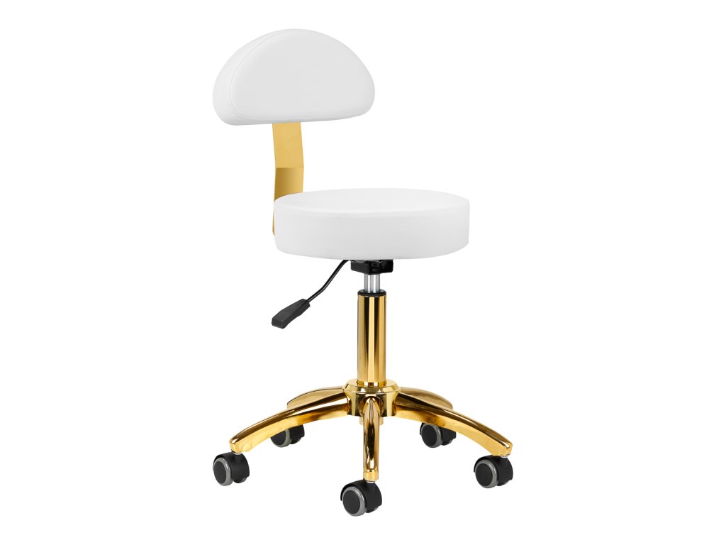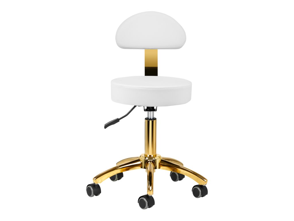 Pětihvězdičkový základ zajišťuje stabilitu a pocit bezpečí i při dynamičtějších pohybech a častých změnách polohy. Vybavena odolnými kolečky zajišťuje vysokou mobilitu, která vám umožní volně se pohybovat v salónu. Čalounění ze syntetické kůže v odstínech bílé, které je nejen odolné, ale také se snadno udržuje v čistotě . Estetické prošívání a prošívání mu dodávají jedinečný vzhled a zlaté ozdobné prvky dodávají luxusní charakter, který přitahuje pozornost. Jedinečné spojení elegance a pohodlí dělá z taburetu nenahraditelný nástroj v práci každého profesionála .