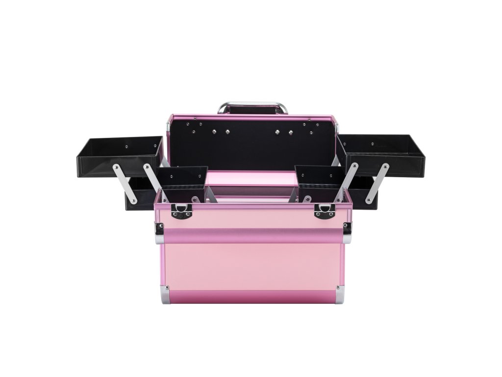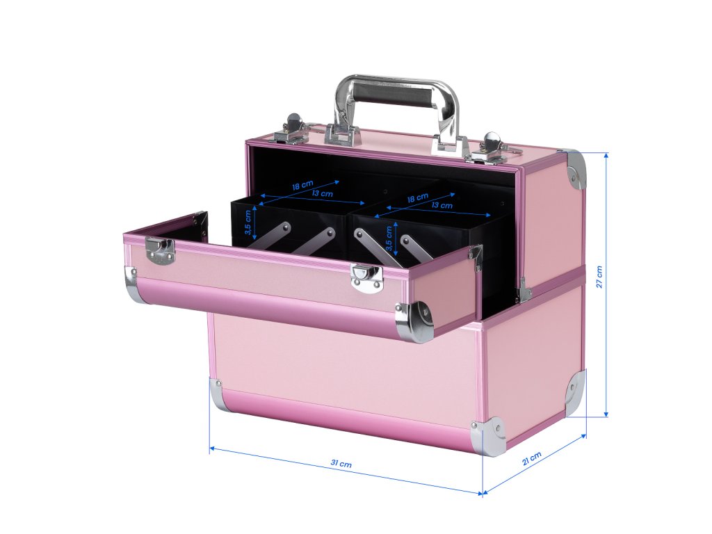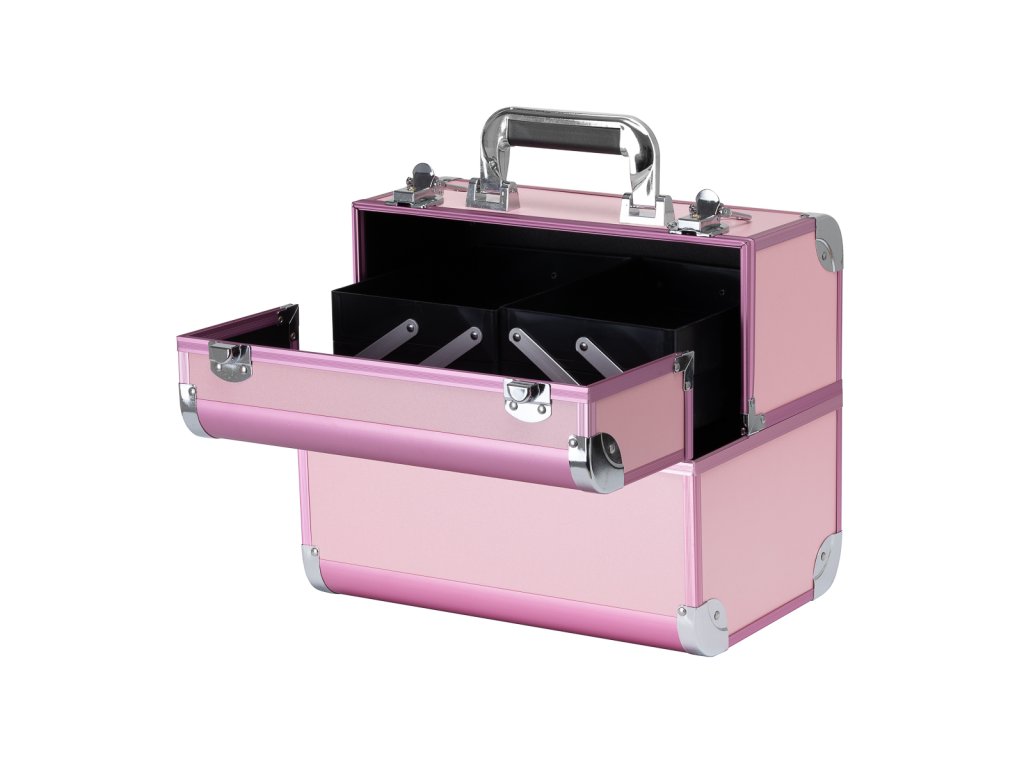 Moderní design v růžových odstínech s kovovými detaily působí elegantně a profesionálně. Pevná rukojeť zajišťuje pohodlné přenášení, zámek na klíček chrání obsah před nechtěným otevřením. Díky své lehkosti je kufřík ideální pro časté přenášení.