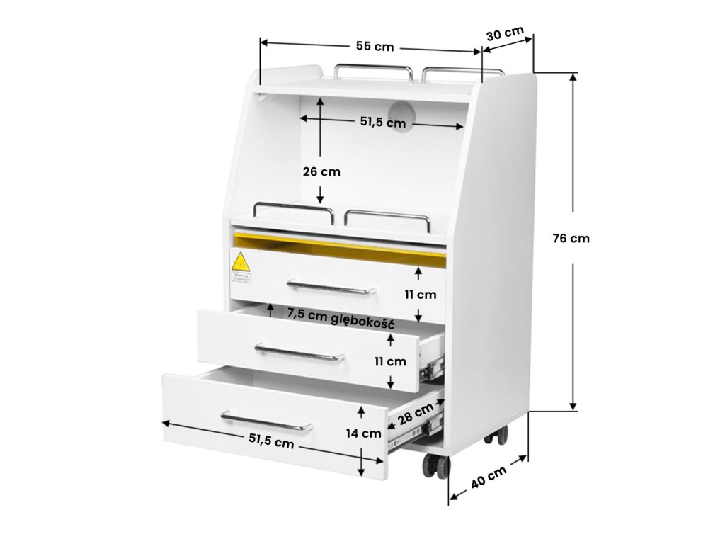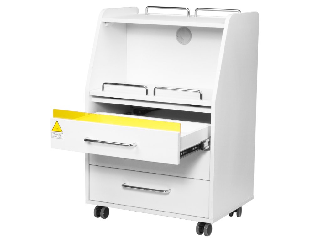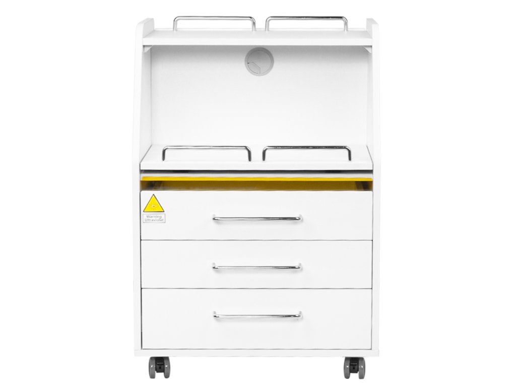 Vysoce kvalitní pomocník v podiatrii je funkční kosmetický kus nábytku na kolečkách. Díky své mobilitě jej můžete přepravit do dalších místností pro ošetření. Asistent má zásuvky na nářadí, příslušenství a výsuvnou polici pro frézku na podiatrii nebo jiné zařízení. Jedna zásuvka má vestavěnou UV-C lampu pro lepší sterilitu nástrojů a příslušenství.