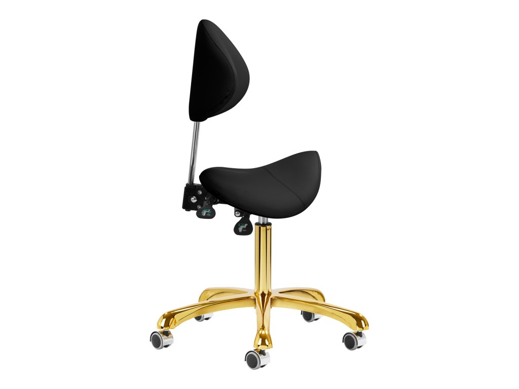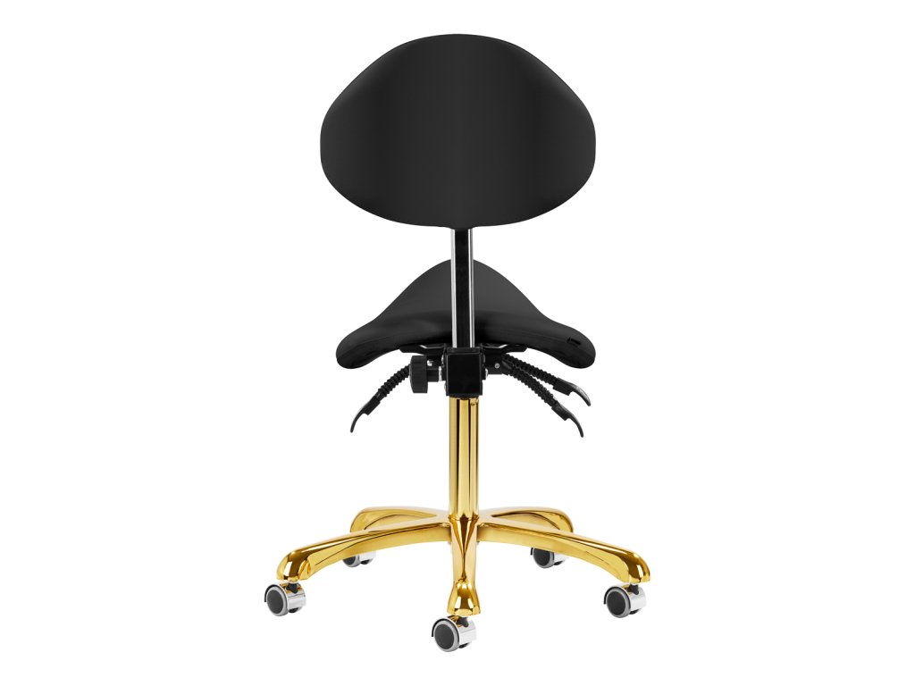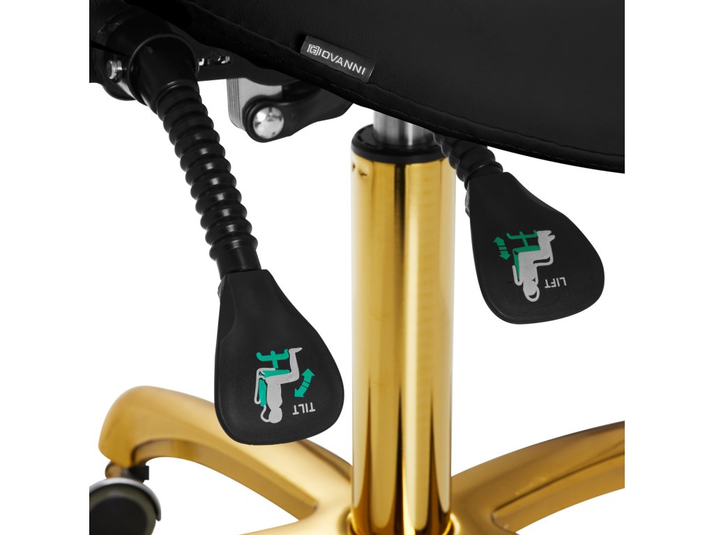 Pěti-paprsková, vhodně navržená základna ve zlatých odstínech činí stoličku stabilní i při intenzivní práci. Kolečka poskytují značnou mobilitu , což usnadňuje přemisťování nábytku po kanceláři. Čalounění odolné taburetky je vyrobeno z imitace kůže v odstínech černé. Díky použití takového materiálu je stolička odolná vůči vlhkosti a snadno se čistí .