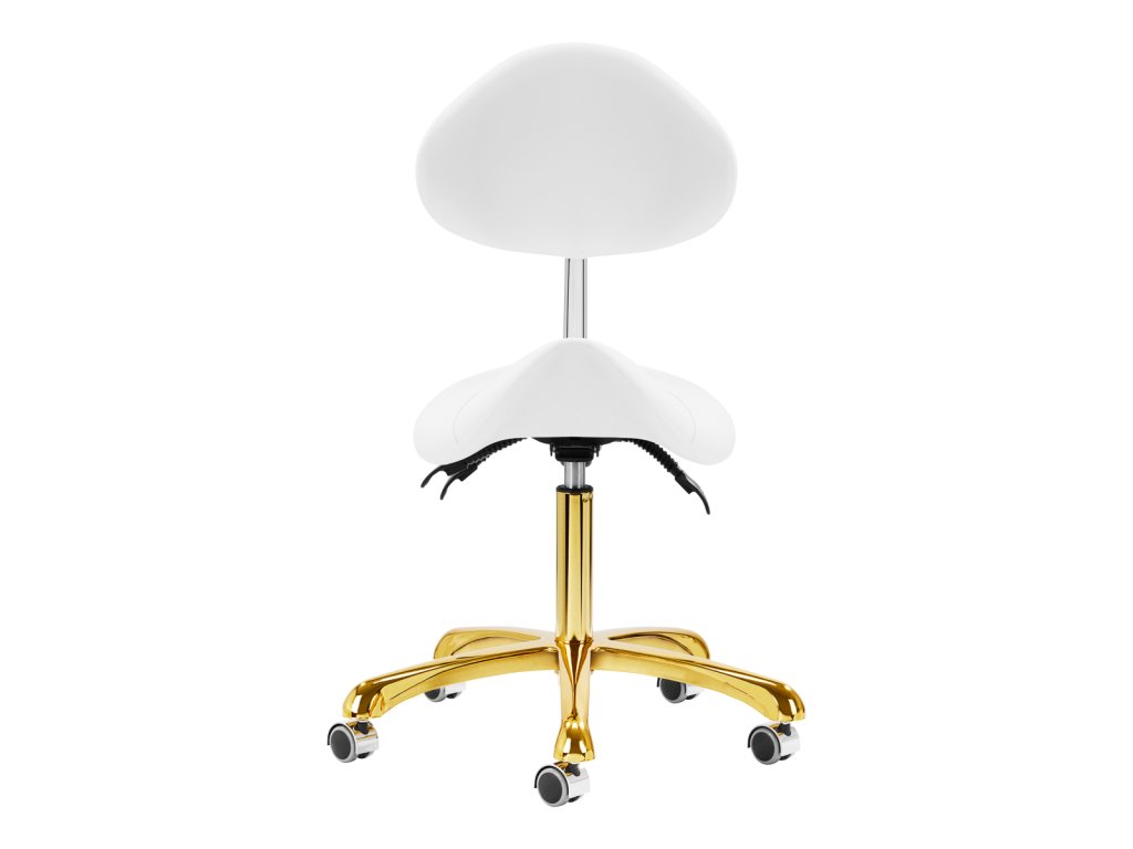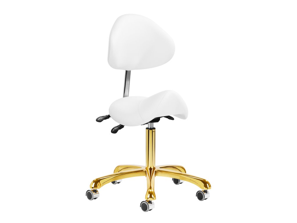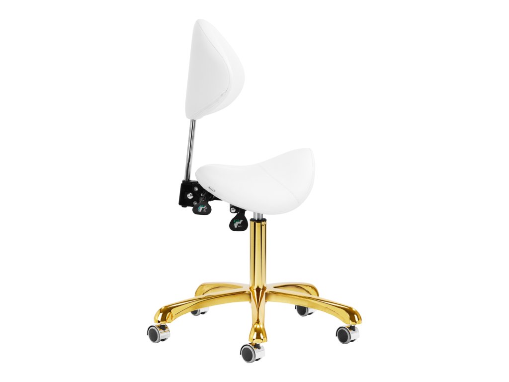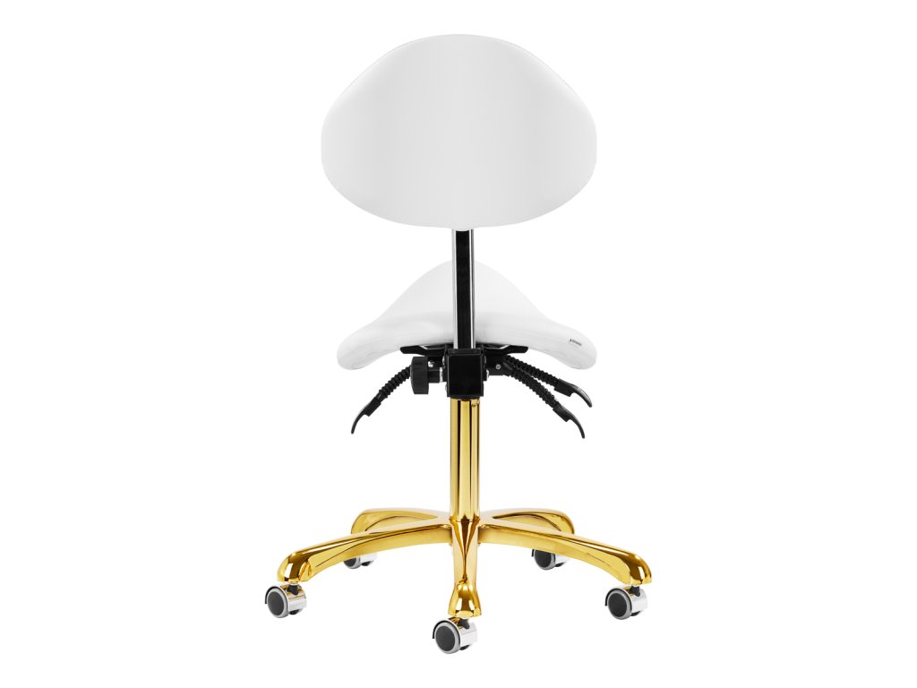 Pěti-paprsková, vhodně navržená základna ve zlatých odstínech činí stoličku stabilní i při intenzivní práci. Kolečka poskytují značnou mobilitu , což usnadňuje přemisťování nábytku po kanceláři. Čalounění odolné taburetky je vyrobeno z imitace kůže v odstínech bílé. Díky použití takového materiálu je stolička odolná vůči vlhkosti a snadno se čistí .