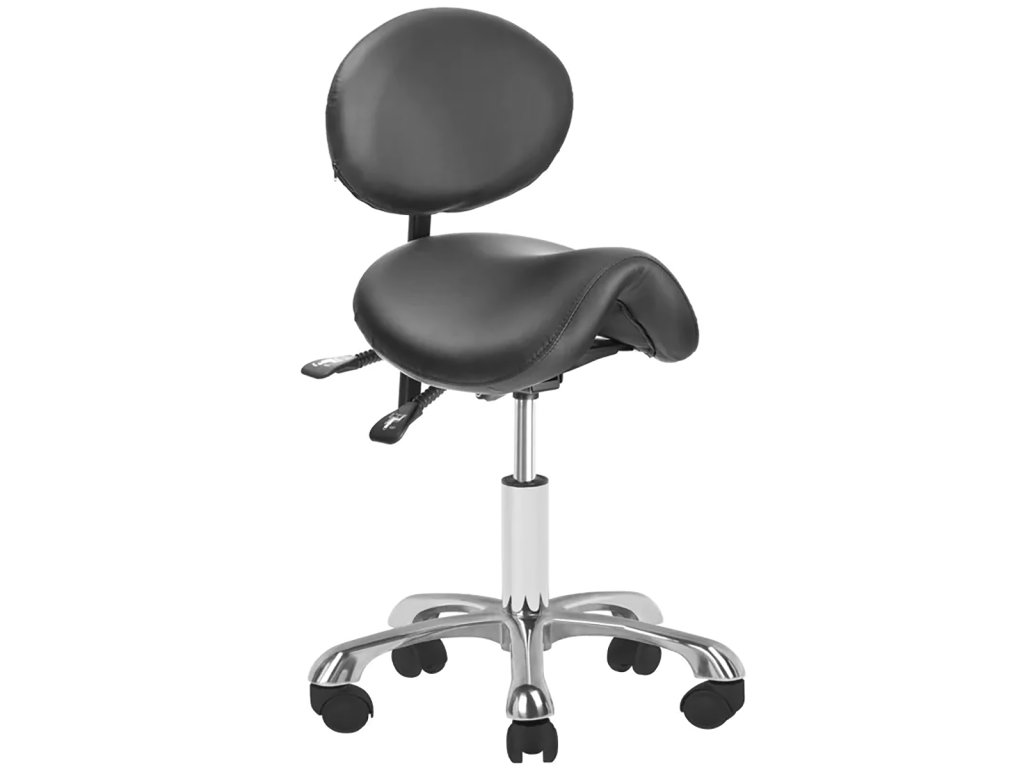 Pohodlná, exkluzivní, stabilní kosmetická stolička s opěradlem a profilovaným sedákem, na pětihvězdičkové, velmi stabilní základně.