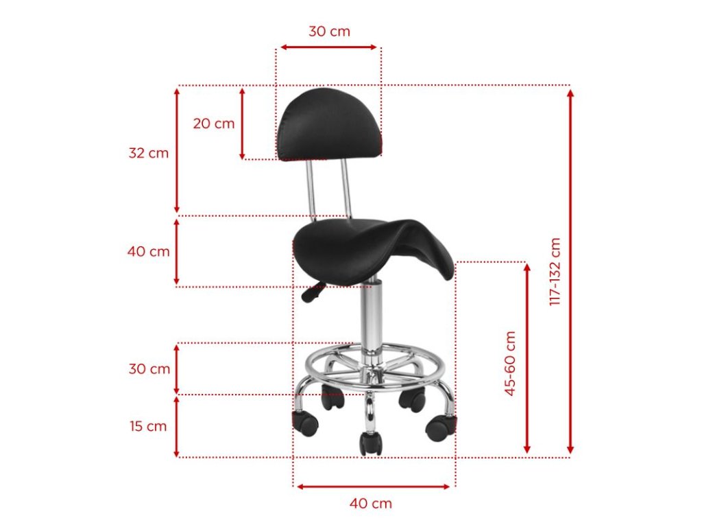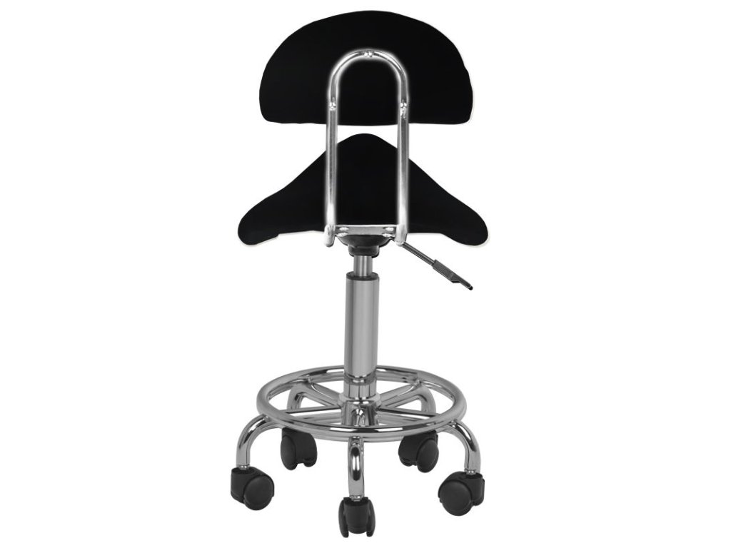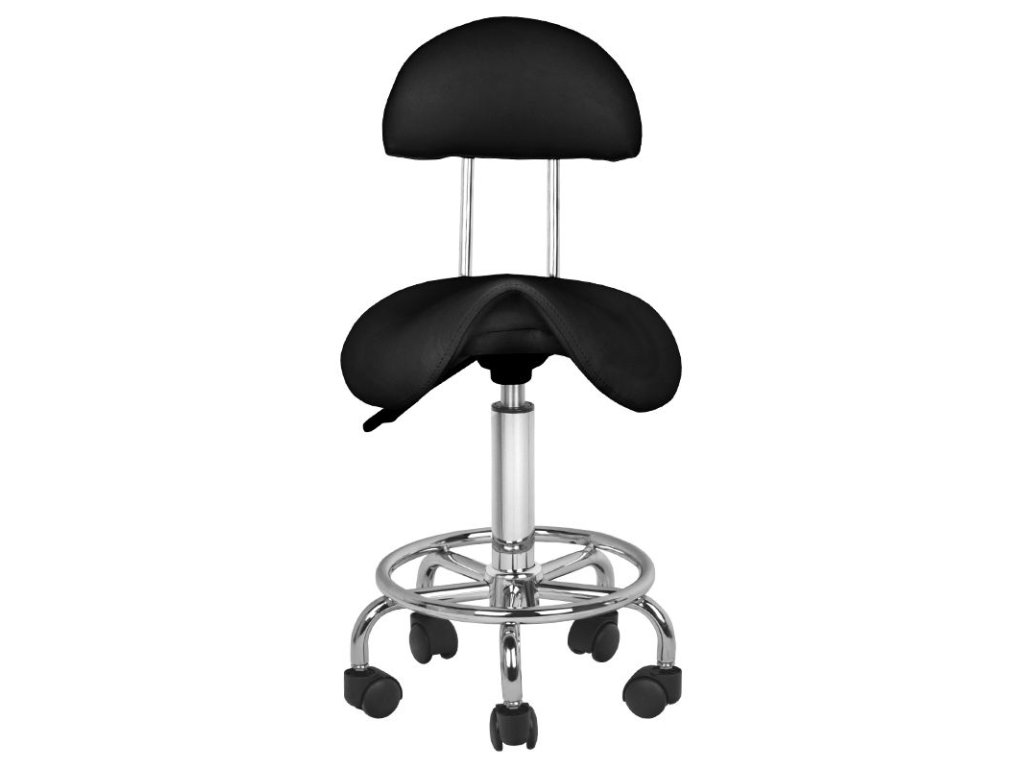 Pohodlná, stabilní kosmetická stolička s opěradlem, s profilovaným sedákem, na pětihvězdičkovém podstavci s plastovými kolečky. K dispozici v černé barvě, nezbytný kus nábytku v salonu krásy.